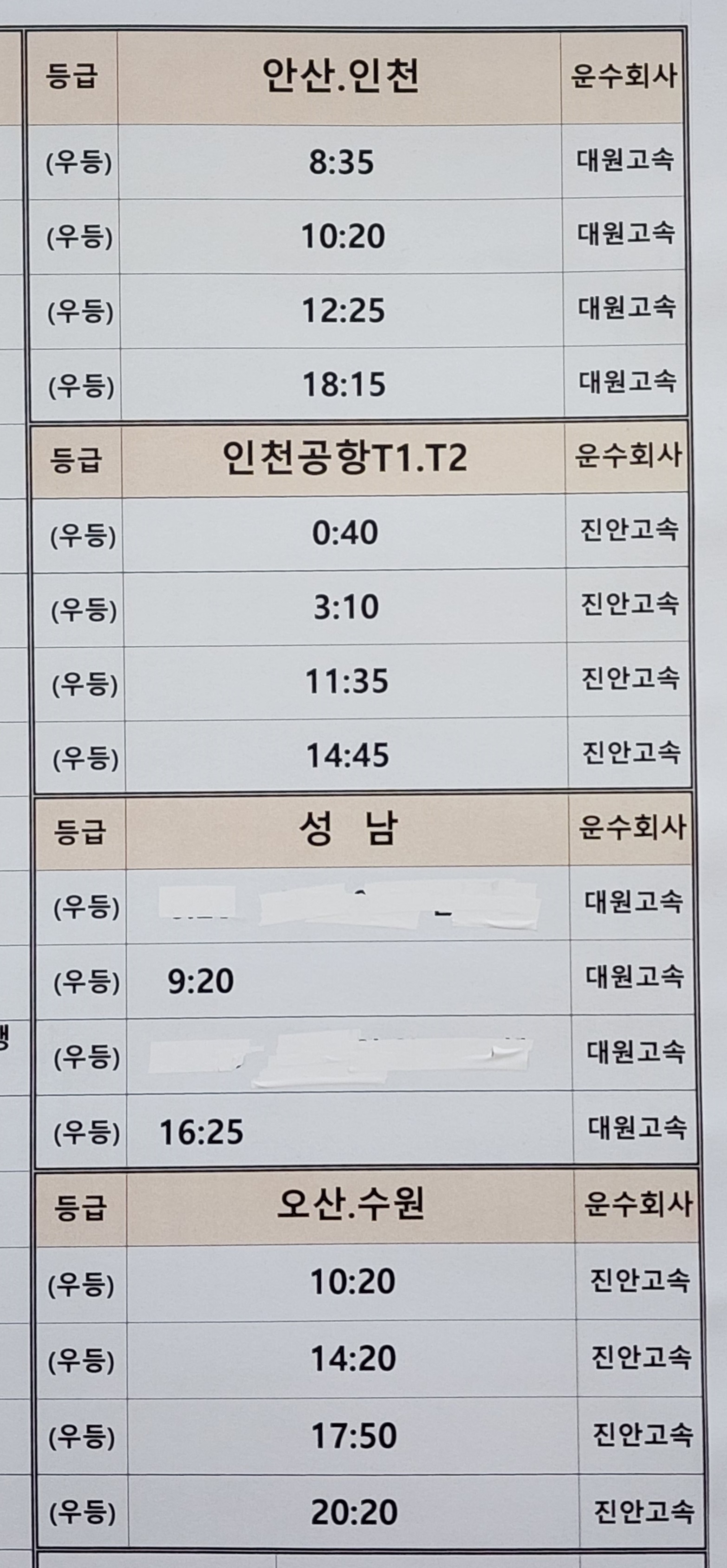 성주 출발 안산, 인천, 오산, 수원 방면.