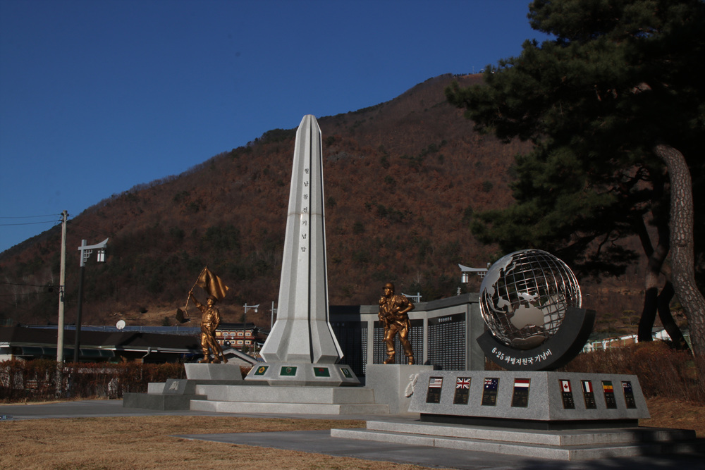 강원도여행 해병대 영월지구 전투전적비 한라산 공비토벌 작전 수행중 6.25전쟁을 맞이한 해병대는 군산 장항, 이리 지구 전투를 시작으로 통영 상륙작전과 인천사육작전을 수행하고 경인지구 작전에서는 중앙청에 태극기를 게양하는 등 서울 탈환에 혁혁한 전공을 수립하였다. 너무나 ㅁㅅ진 모습으로 서 있는 전적비는 나라를 위해서 희생하신 그 뜻을 놀치기에 알맞다. 6.25 파병 지원국 기념비 우리나라가 전쟁에 처했을 대 먼곳에서 우리를 위하여 달려와 준 분들에게 다시 한번더 감를 드린다. 한명의 국군은 승리의 깃발을 또 다른 한명의 국군은 전쟁 고아를 안고 있다. 따뜻한 우리 국군의 모습이다. 근처에는 충혼탑이 서 있는데 호국영령들의 숭고한 희생정신과 애국정신의 바탕위에서 이룩되었습니다. 이곳은 6.25 전쟁중 호..