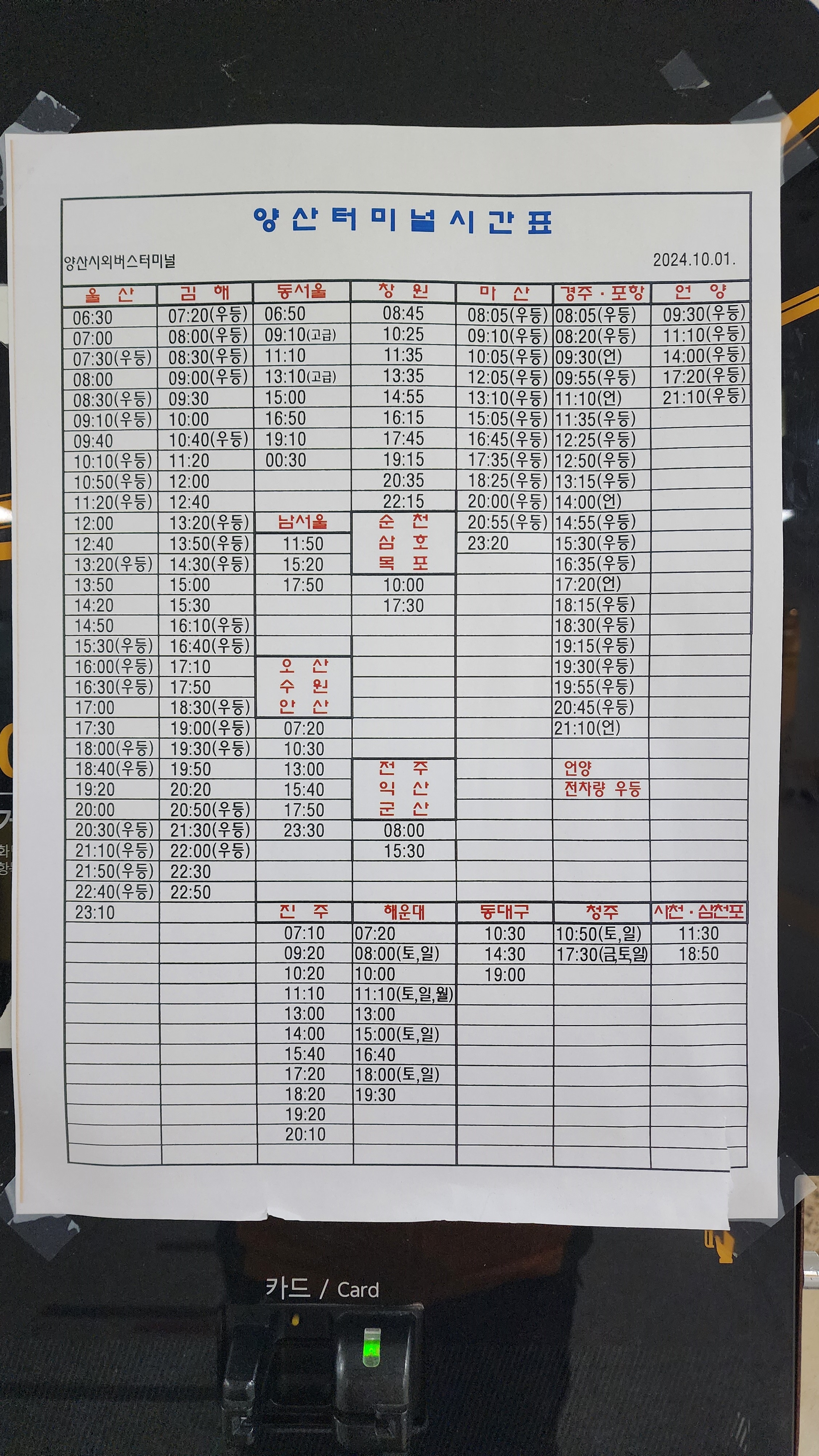 안동시외버스터미널 시간표 공영주차장 요금표안동 출발 서울, 인천, 경기도, 부산, 경남, 대전, 충청도, 강원도 방면. 안동 출발 서울경부 강남, 동서울 방면. 안동 출발 안산, 인천 영주 경유, 인천공항, 수원, 성남, 안양, 부천, 의정부, 고양, 오산, 의성, 구미 방면. 안동 출발 부산, 경주, 울산, 마산, 창원, 대전, 구미, 의성, 군위, 구미, 청주, 원주, 강릉, 속초 방면. 안동 출발 경상북도 방면. 안동 출발 동대구, 의성, 북대구, 안계, 비안 방면. 안동 출발 영양, 청송, 주왕산, 영주 방면. 안동 출발 봉화, 신도청, 예천, 점촌, 진보, 영덕, 영해, 안덕, 도평, 포항 방면. 안동시외버스터미널 요금표 안동버스터미널 공영주차장 요금표안동터미널 전화번호 :1688-8228고속,..