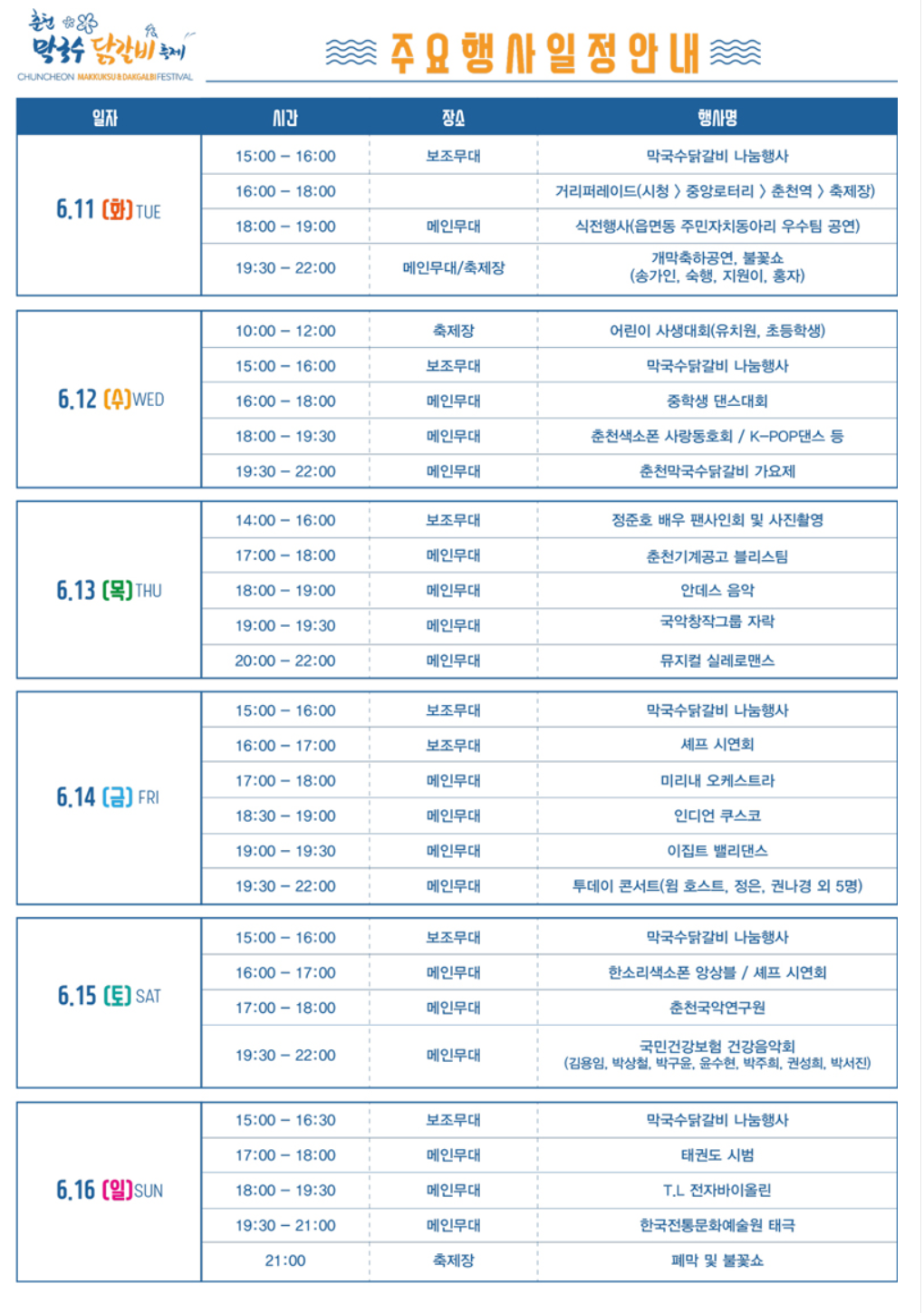 오는 6월 11일부터 16일까지 열리는 춘천닭갈비막국수축제에 여러분들의 많은 참여가 있길 기대하여 봅니다.
