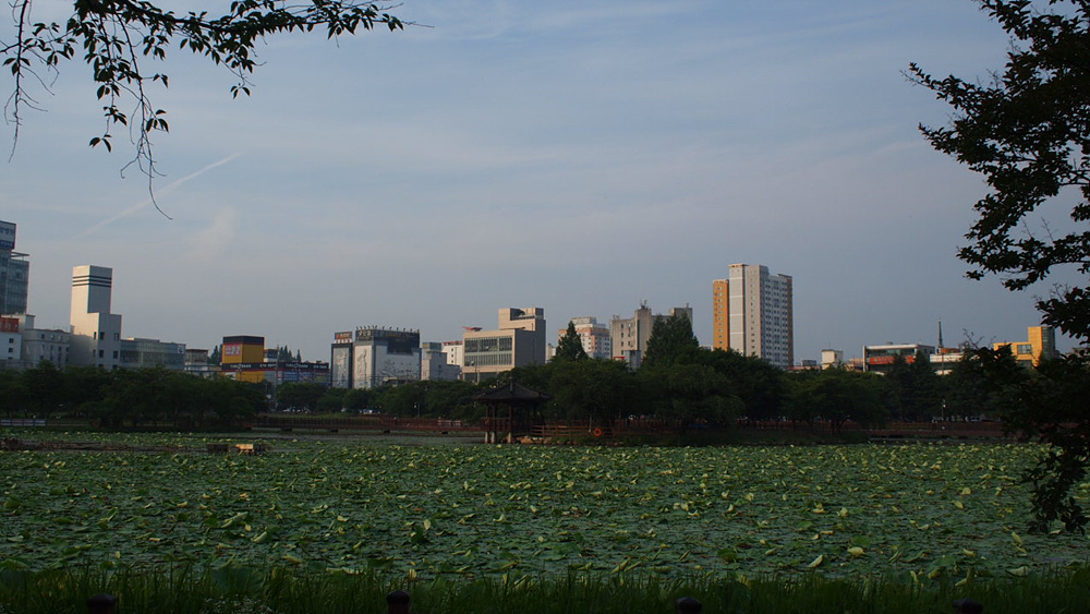 수많은 연잎 위로 도시의 고층건물이 눈에 들어옵니다.