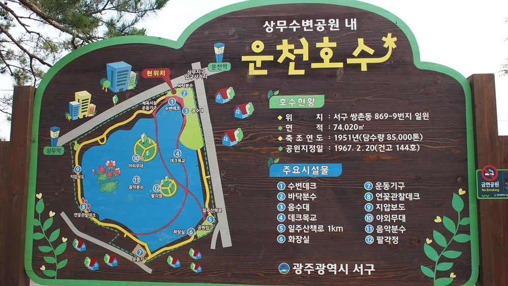 상무 수변공원 내 운천호수는 주요 시설물로 수변데크, 바닥분수, 음수대, 데크 육교, 일주산택로 1km, 화장실, 운동기구,