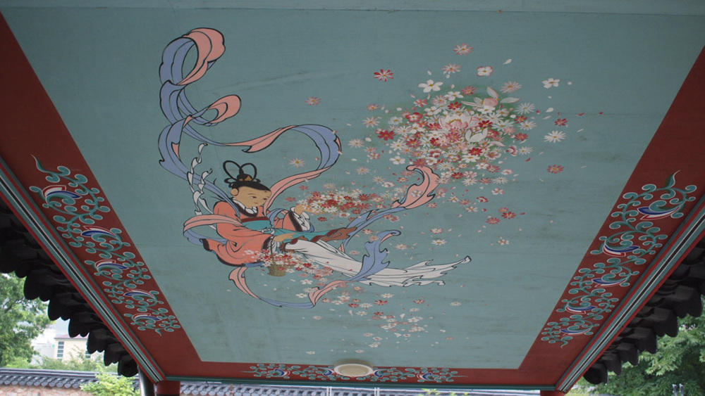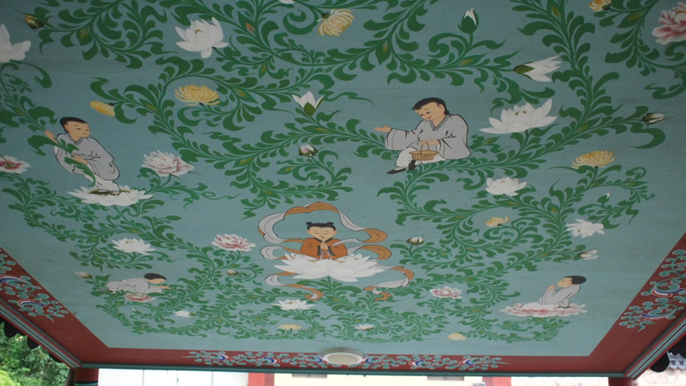 계단에는 지붕이 설치되어 있는데 천정화가 하기동자들을 표현하고 있는것 같습니다.