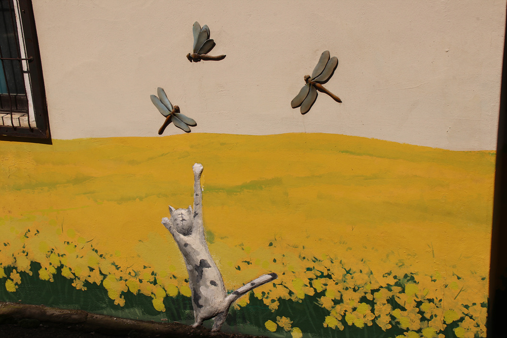 온 동네가 노란색 물결로 뒤덮여 있으며 그 속에는 입체로 부착된 해바라기가 유독 눈에 들어옵니다.