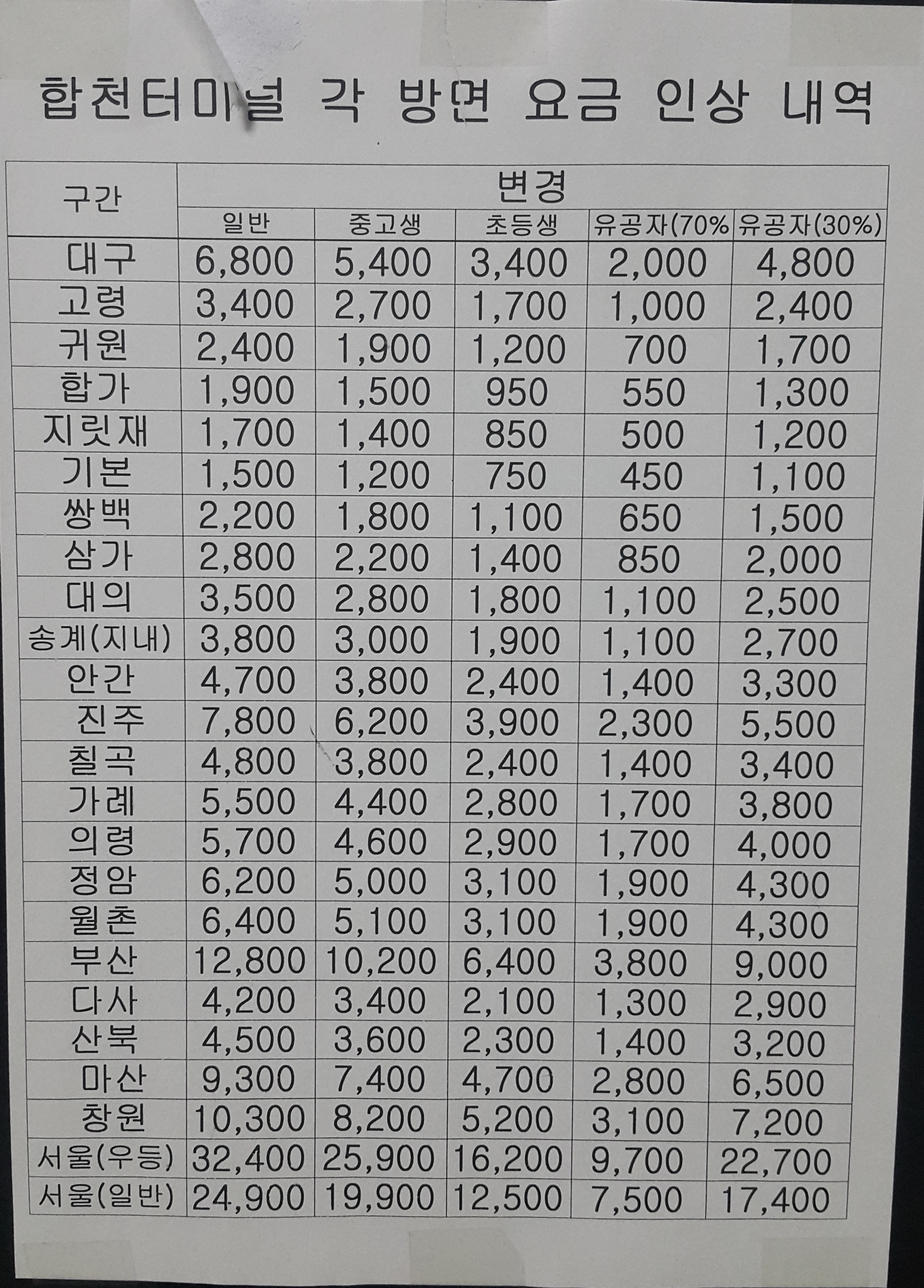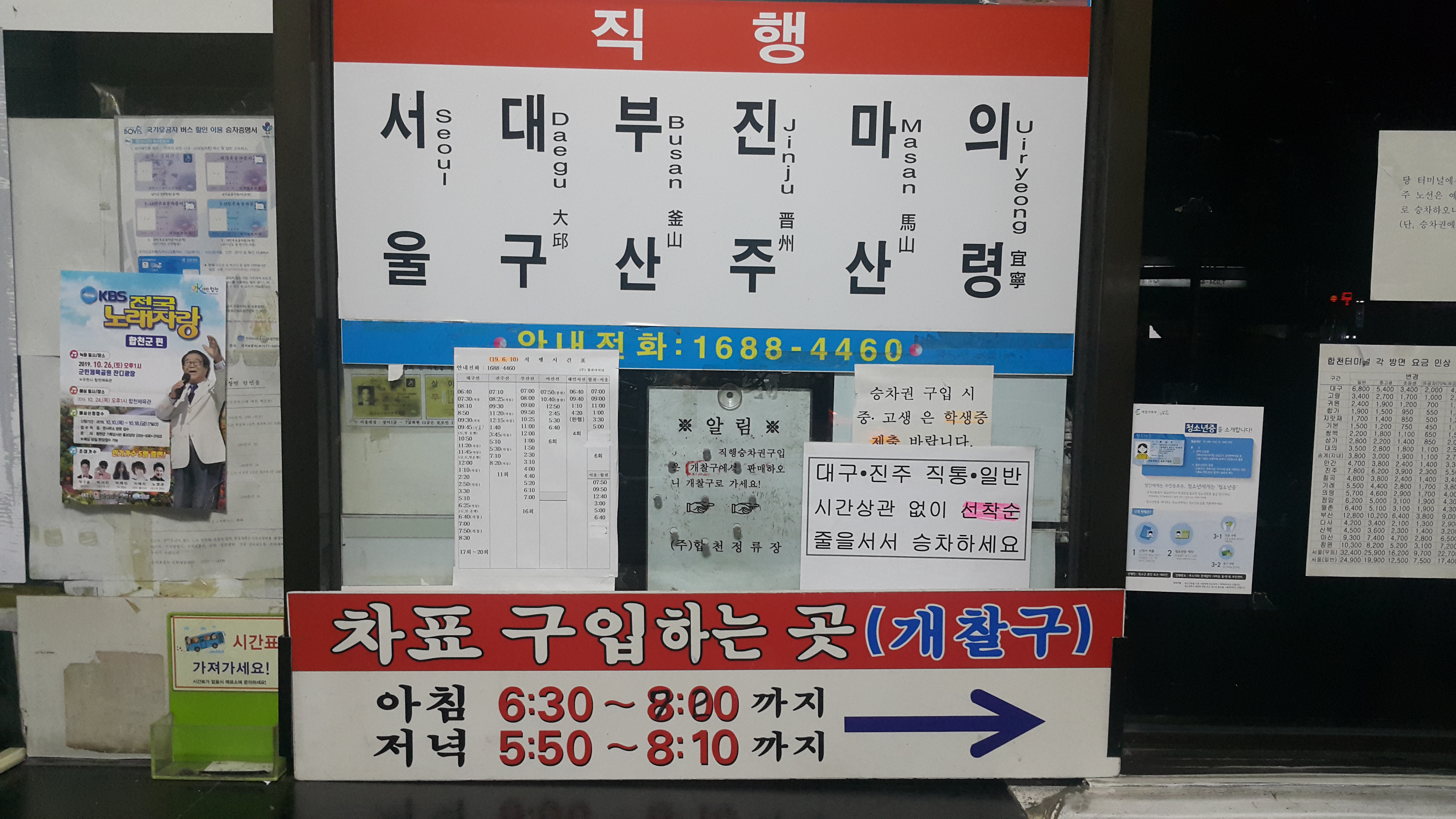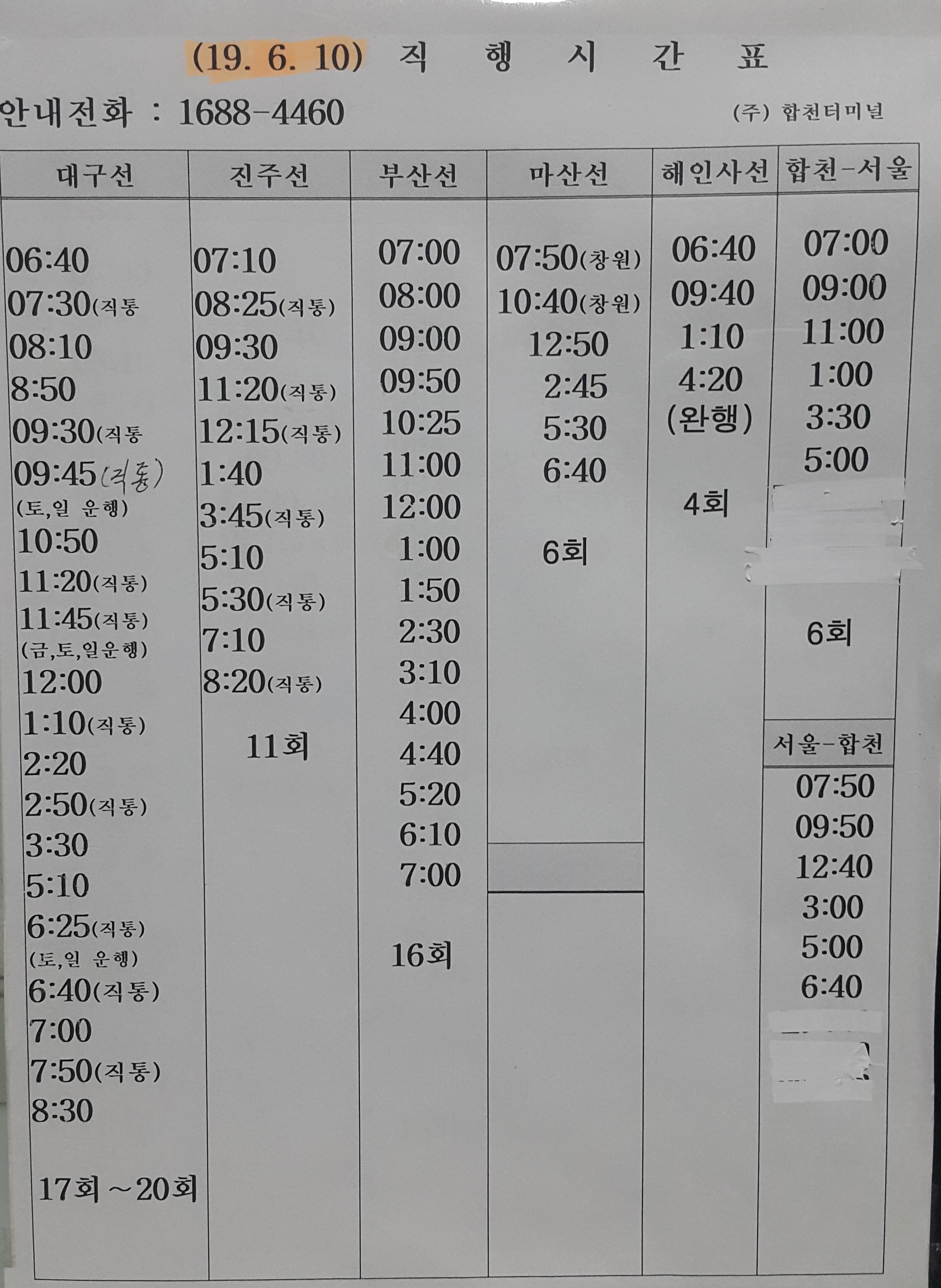 합천 출발 대구, 진주, 부산, 마산, 서울, 해인사 방면.