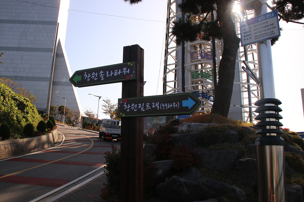 길을 따라 왼쪽으로 가면 창원솔라타워가 있고 오른쪽으로 가면 창원짚트랙 99타워가 있다.