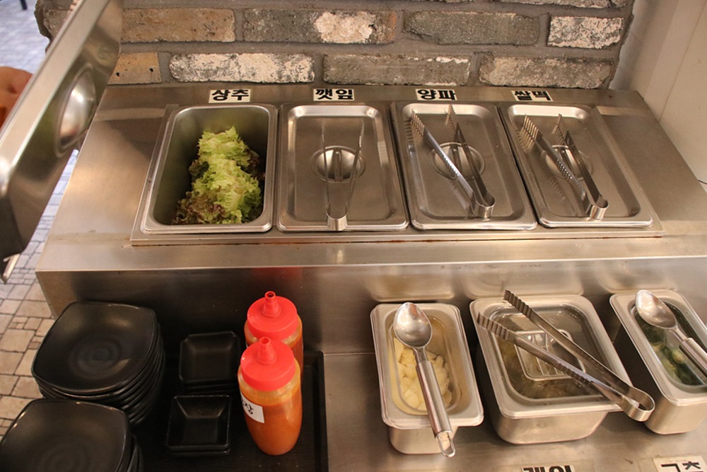 셀프 반찬코너에서는 상추, 깻잎, 양파, 쌀떡, 마늘, 고추 등을 추가로 가져갈 수 있게 하였습니다.