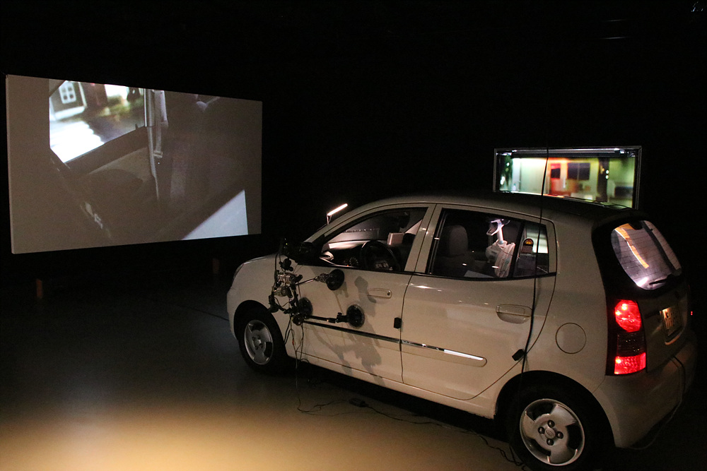 정연두의 자동차 극장은 관객이 전시장에 설치된 자동차를 타고 실제로 드라이브하는 것처럼 촬영되는 장면을