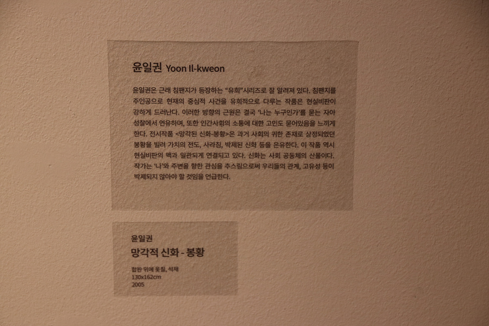 윤일권의 <망각적 신화 - 봉황>(2005)은 현대 사회에서 변화해 가는 인간 존재를 표출시킨다.