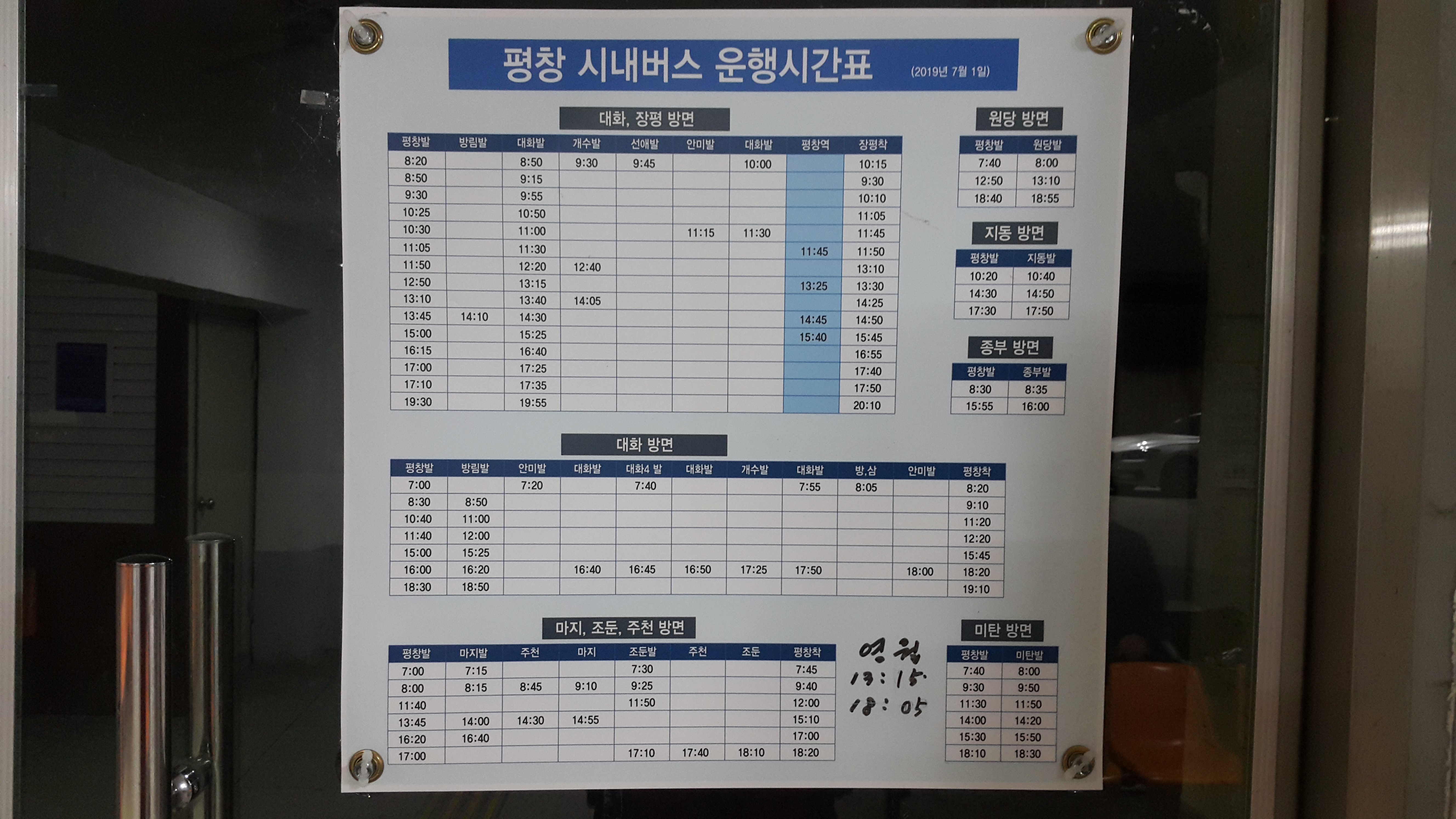 평창 출발 대화, 장평, 조둔, 발임, 영월, 주천, 지동, 종부, 미탄, 마지, 원당 방면.