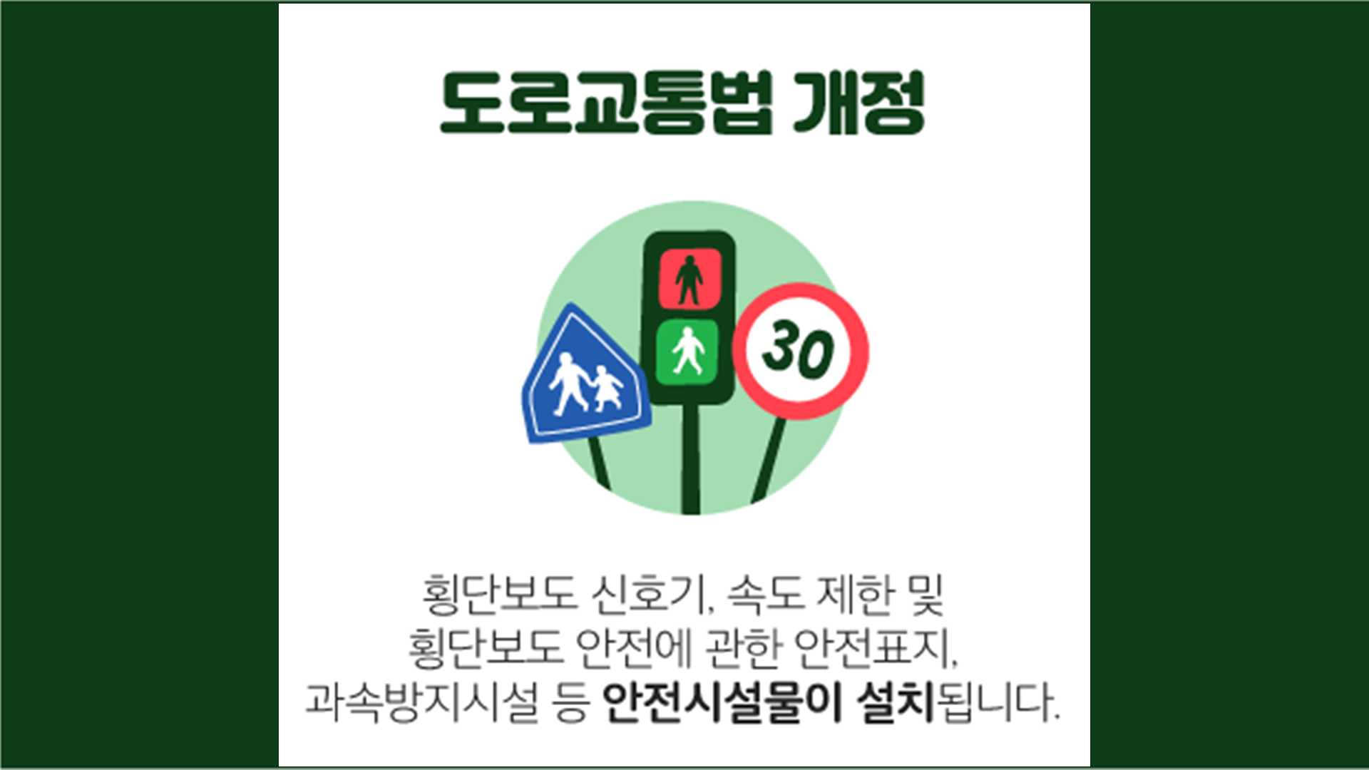 □ 도로교통법 개정안에서는 어린이 보호구역 내 운전자의 법규위반을 감소시키기 위해 과속 단속카메라, 과속 방지턱, 신호등의 설치를 의무화했다.