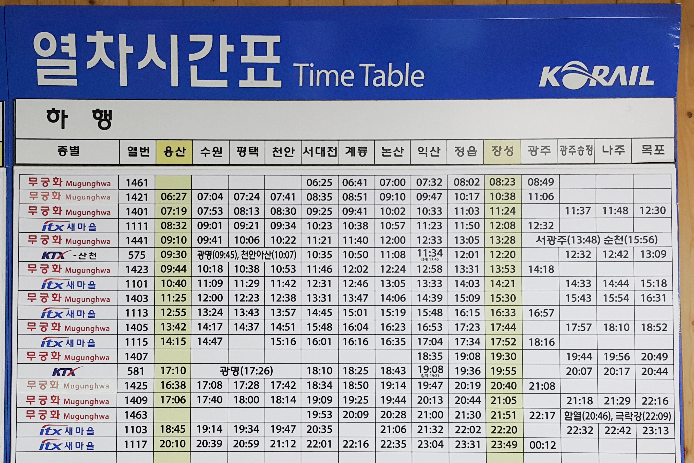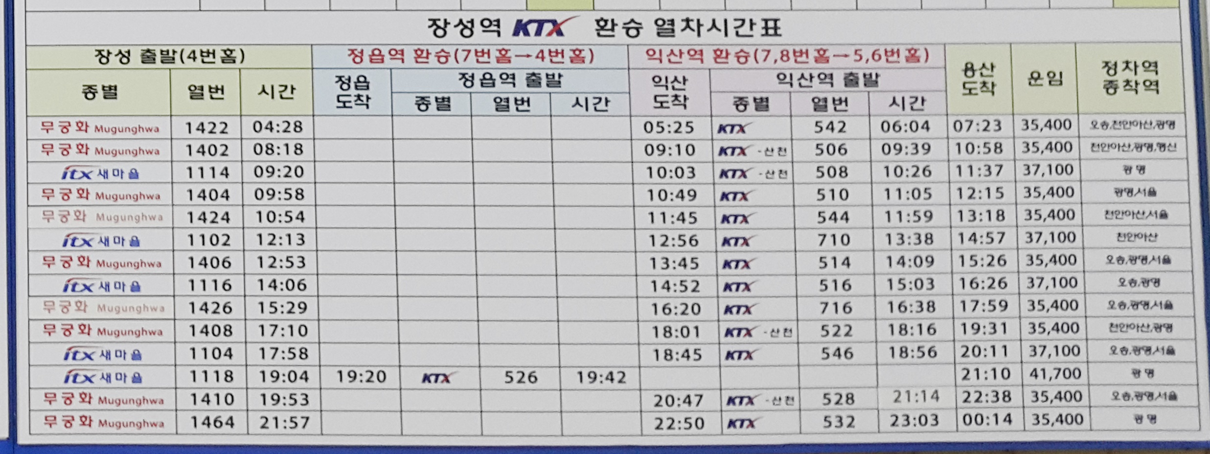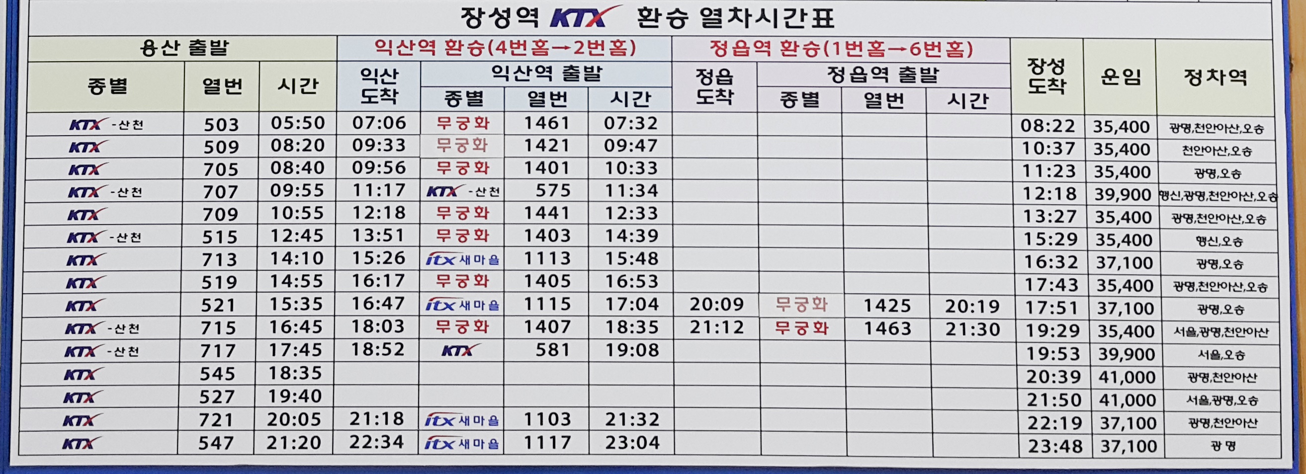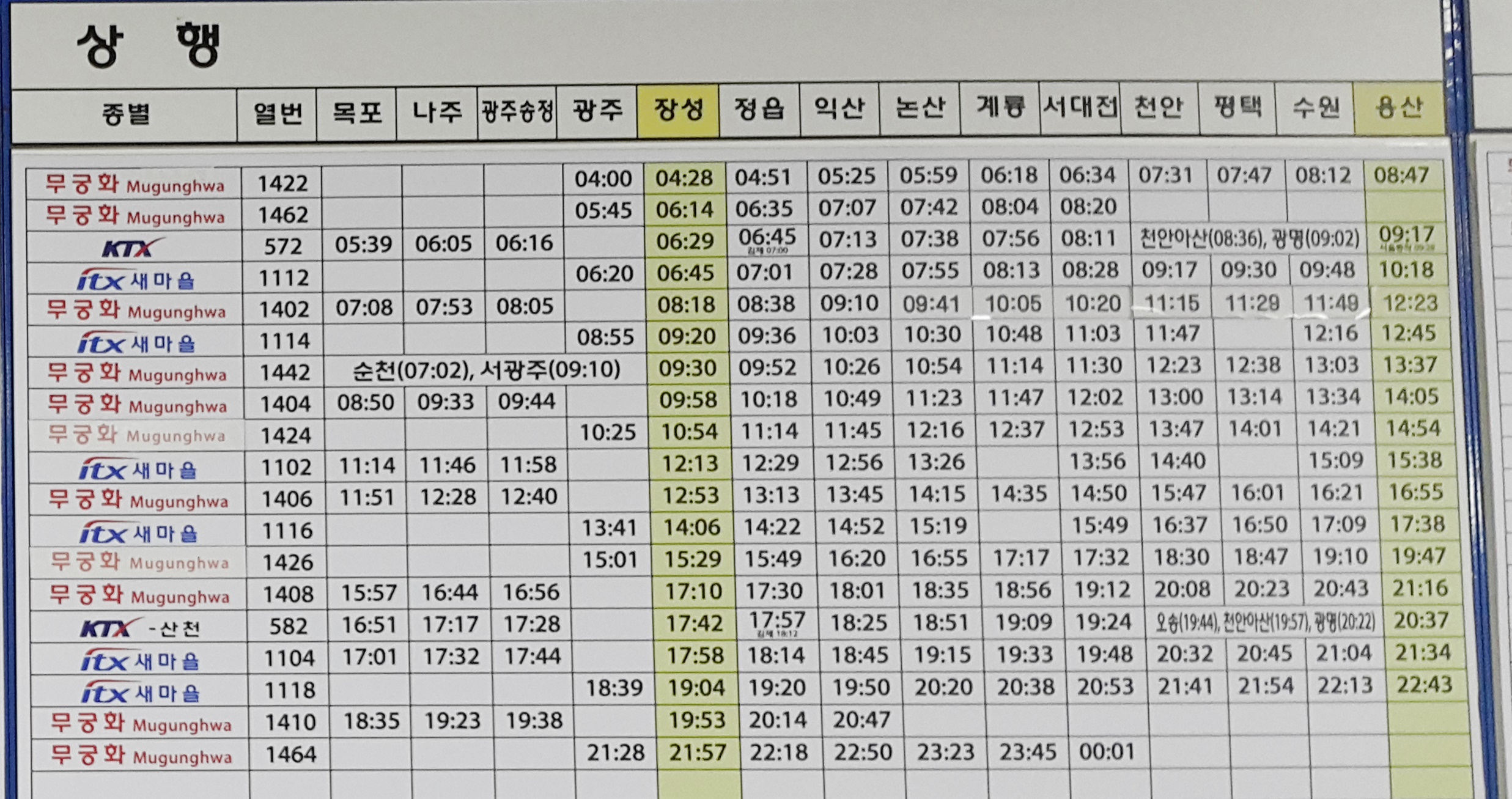 장성역 출발 정읍, 익산, 논산, 계룡, 서대전, 천안, 평택, 수원, 용산 방면.