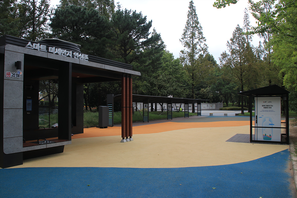 이제 김해산책 후에는 빈 병과 페트병은 AI 재활용품 회수 로봇 스마트쉼터 쉬고 가야에서 현금 포인트로