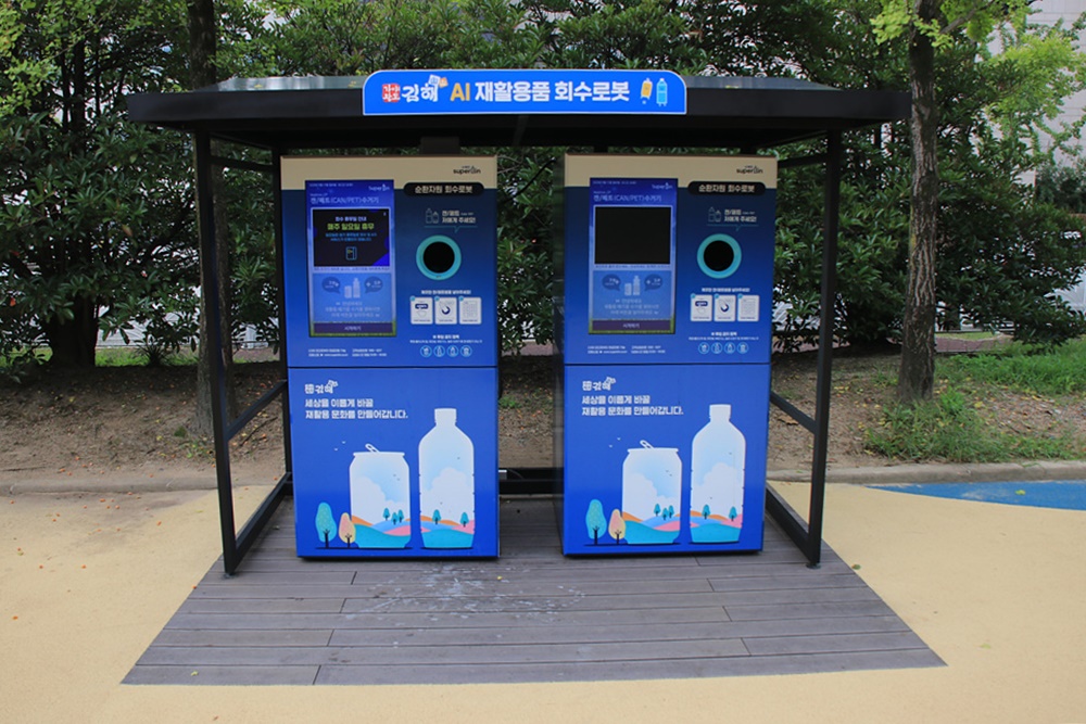스마트 관광 도시 김해 AI 재활용품 회수 로봇 스마트쉼터 쉬고 가야에서 빈생수병과 빈 캔은 현금 포인트로 받아 가세요