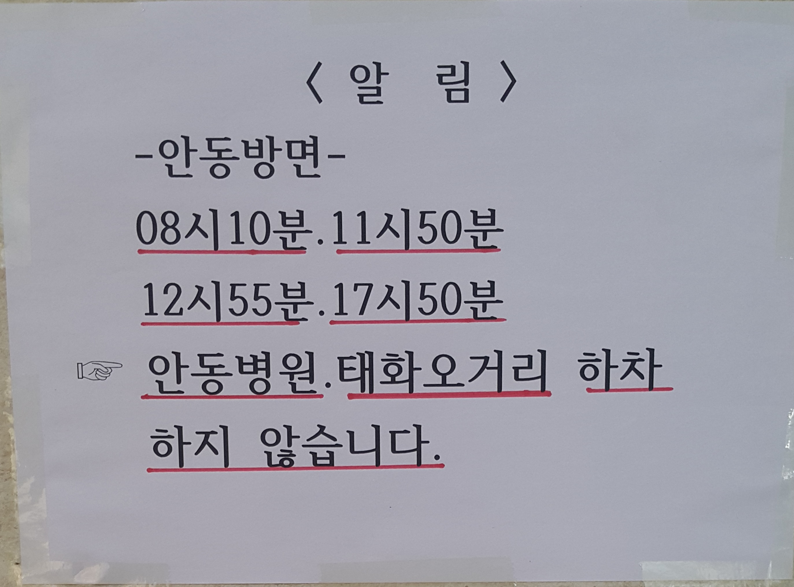 08:10, 11:50, 12:55, 17:50 은 안동병원, 태화오거리 하차하지 않습니다.