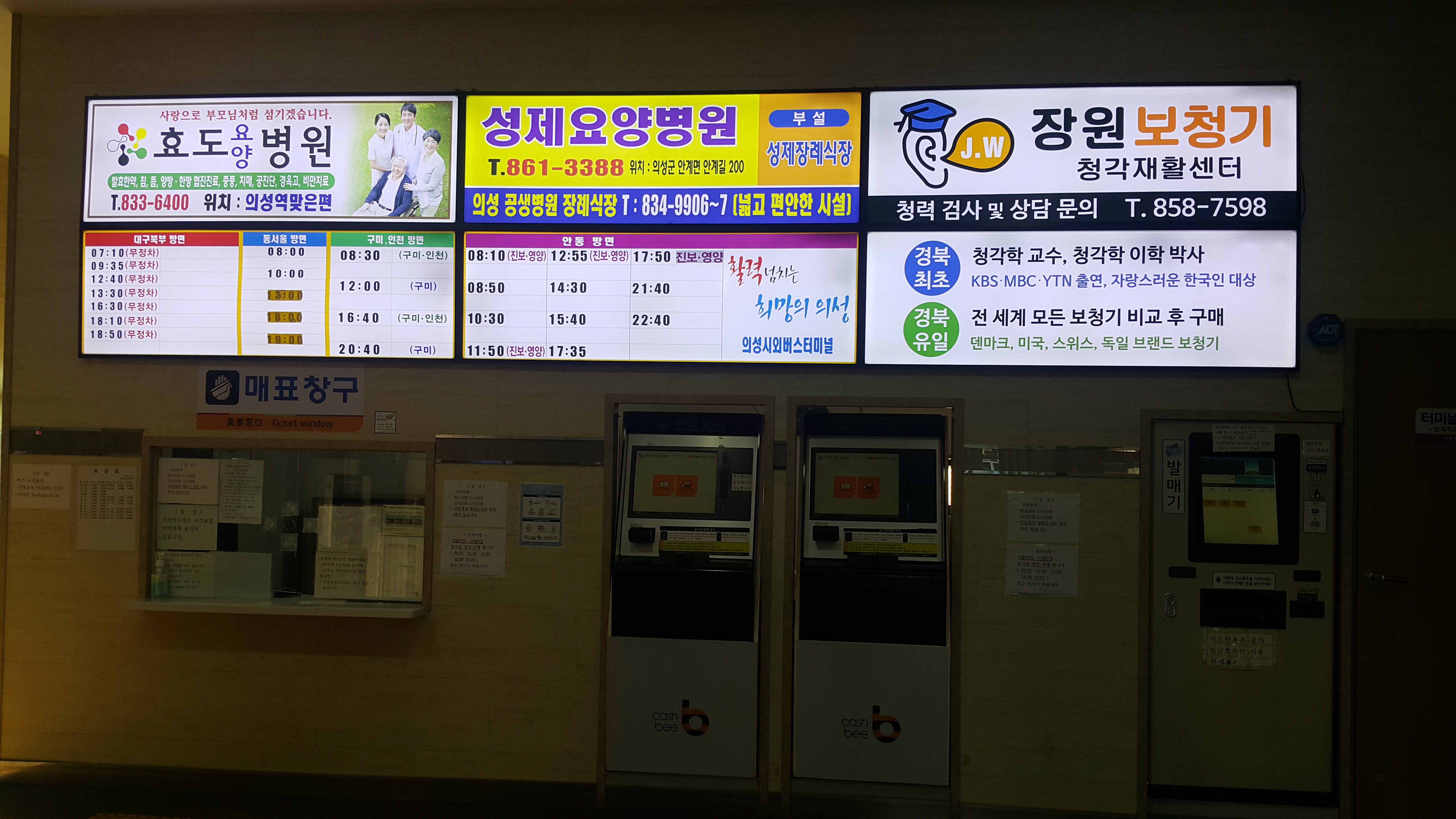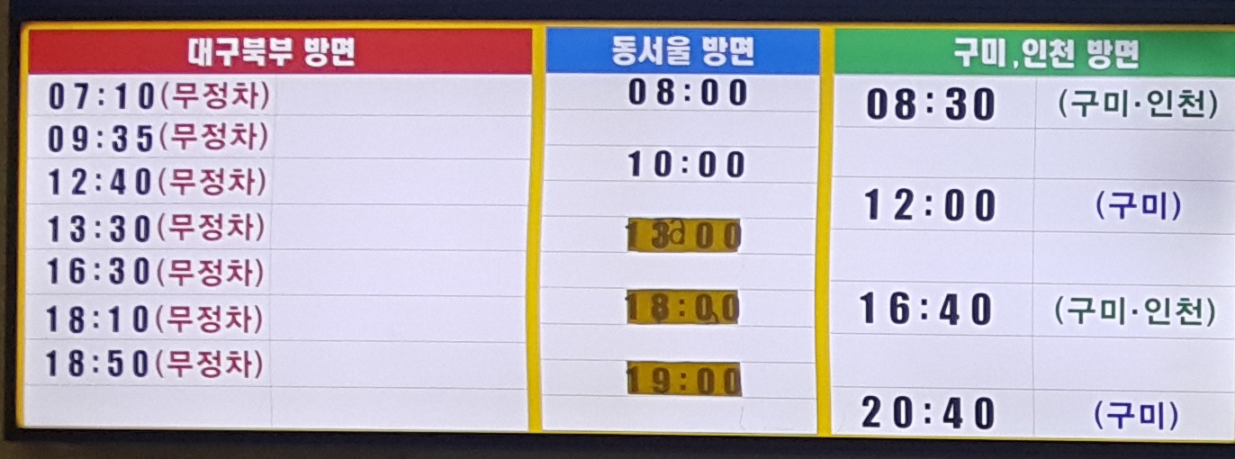 의성시외버스터미널 출발 대구 북부, 동서울, 구미, 인천 방면.