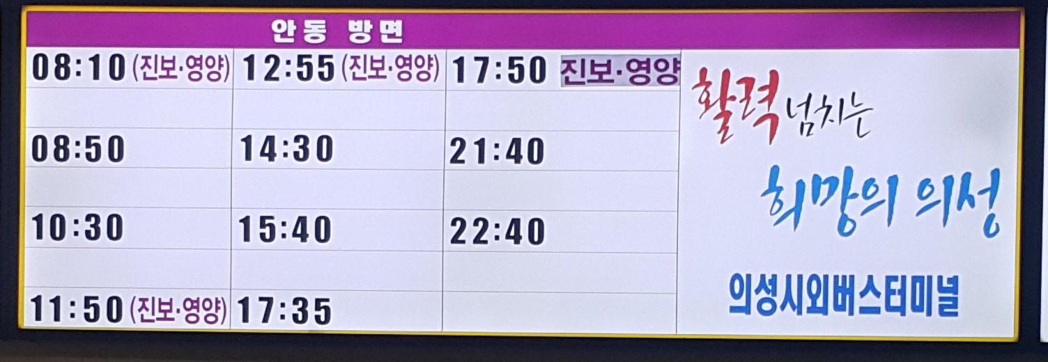 의성시외버스터미널 출발 안동, 진보, 영양 방면.