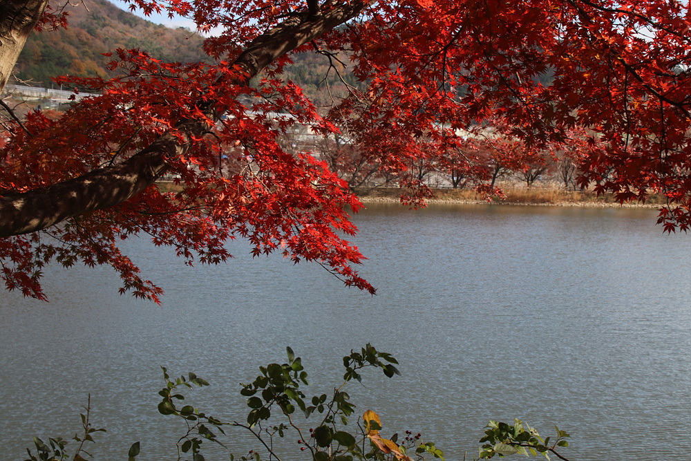 저수지 곁에 피어 있는 단풍나무의 모습이 더욱더 강렬하게 보입니다.