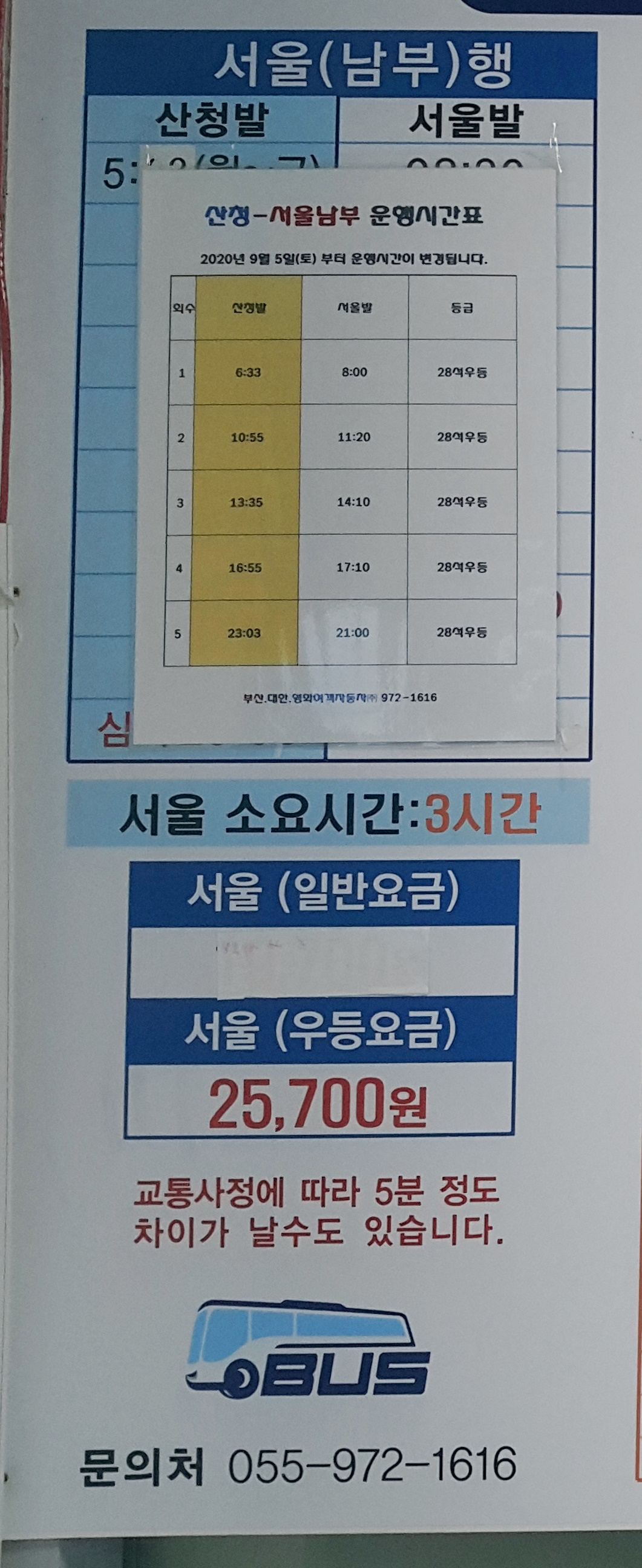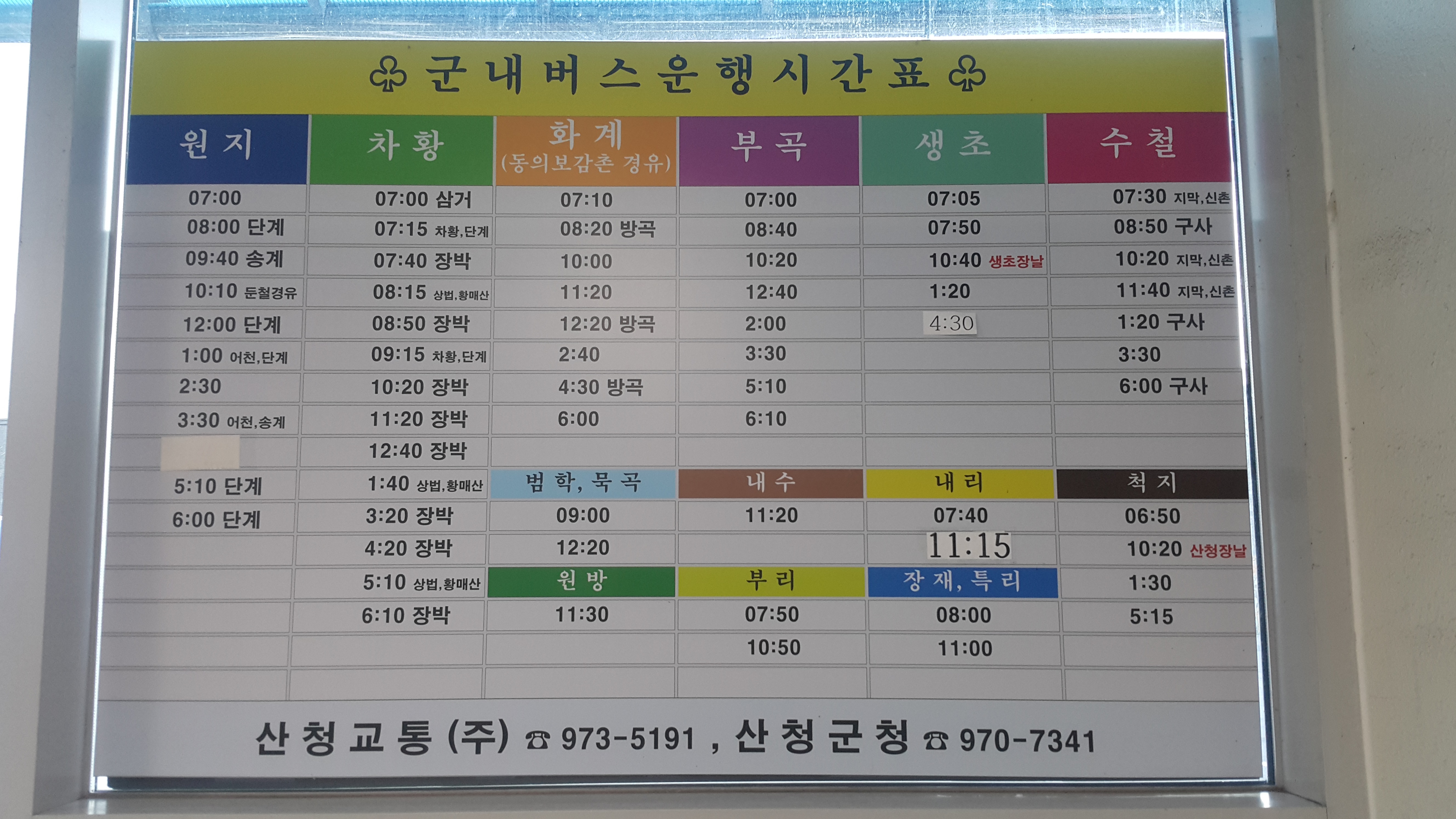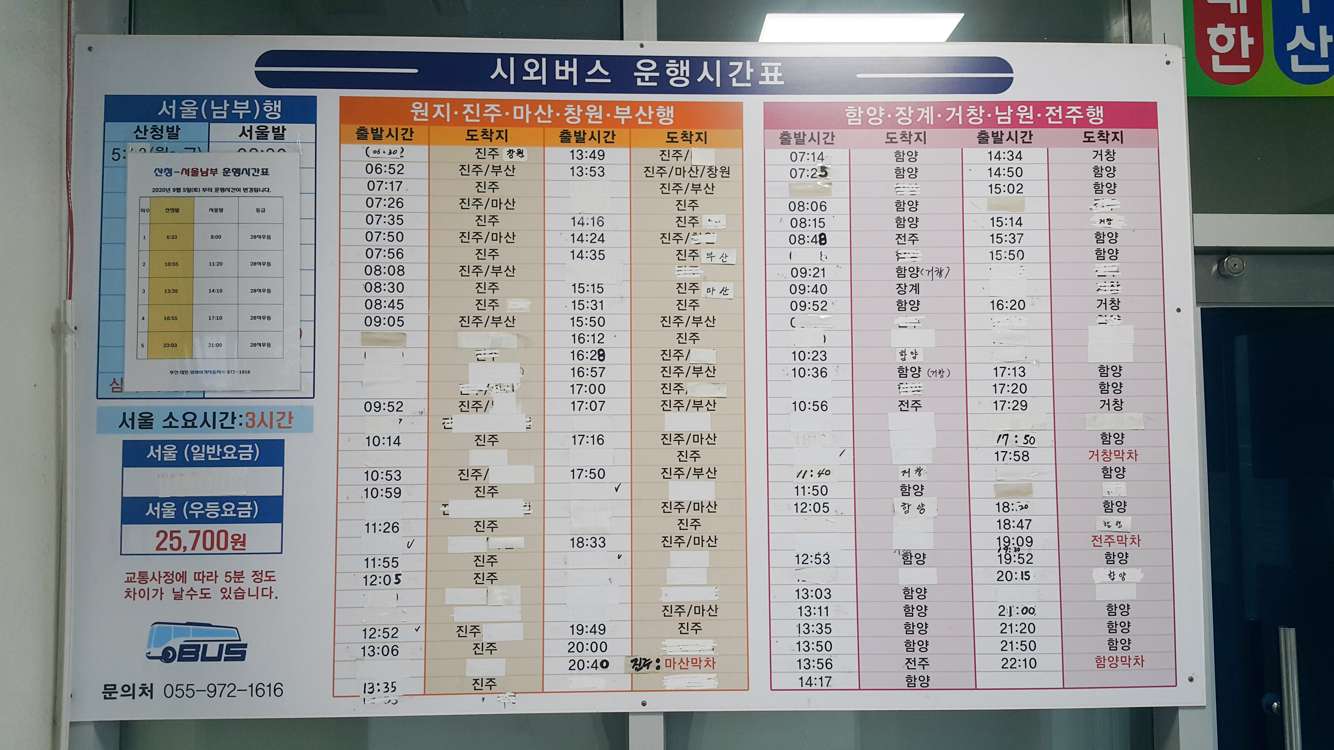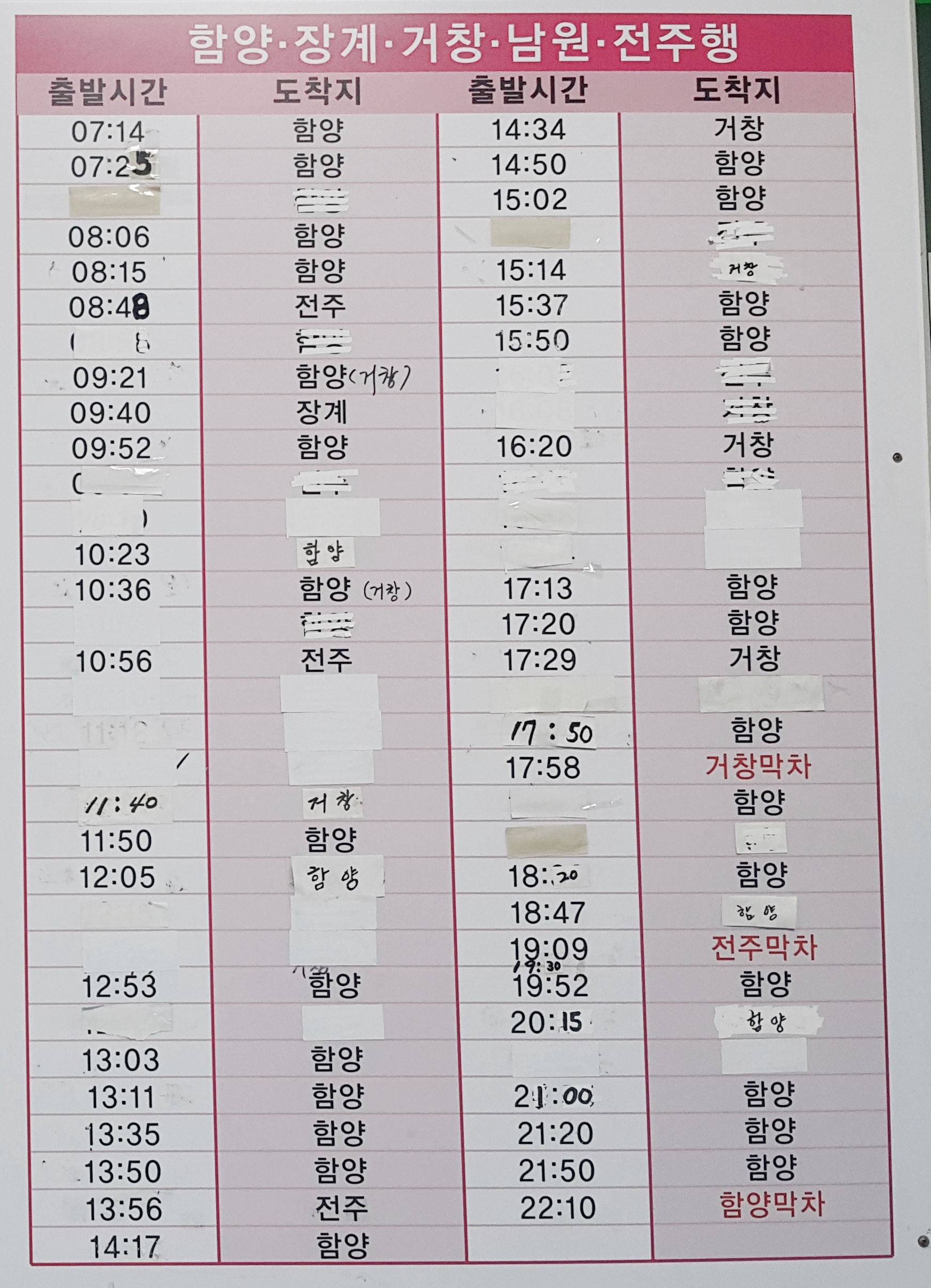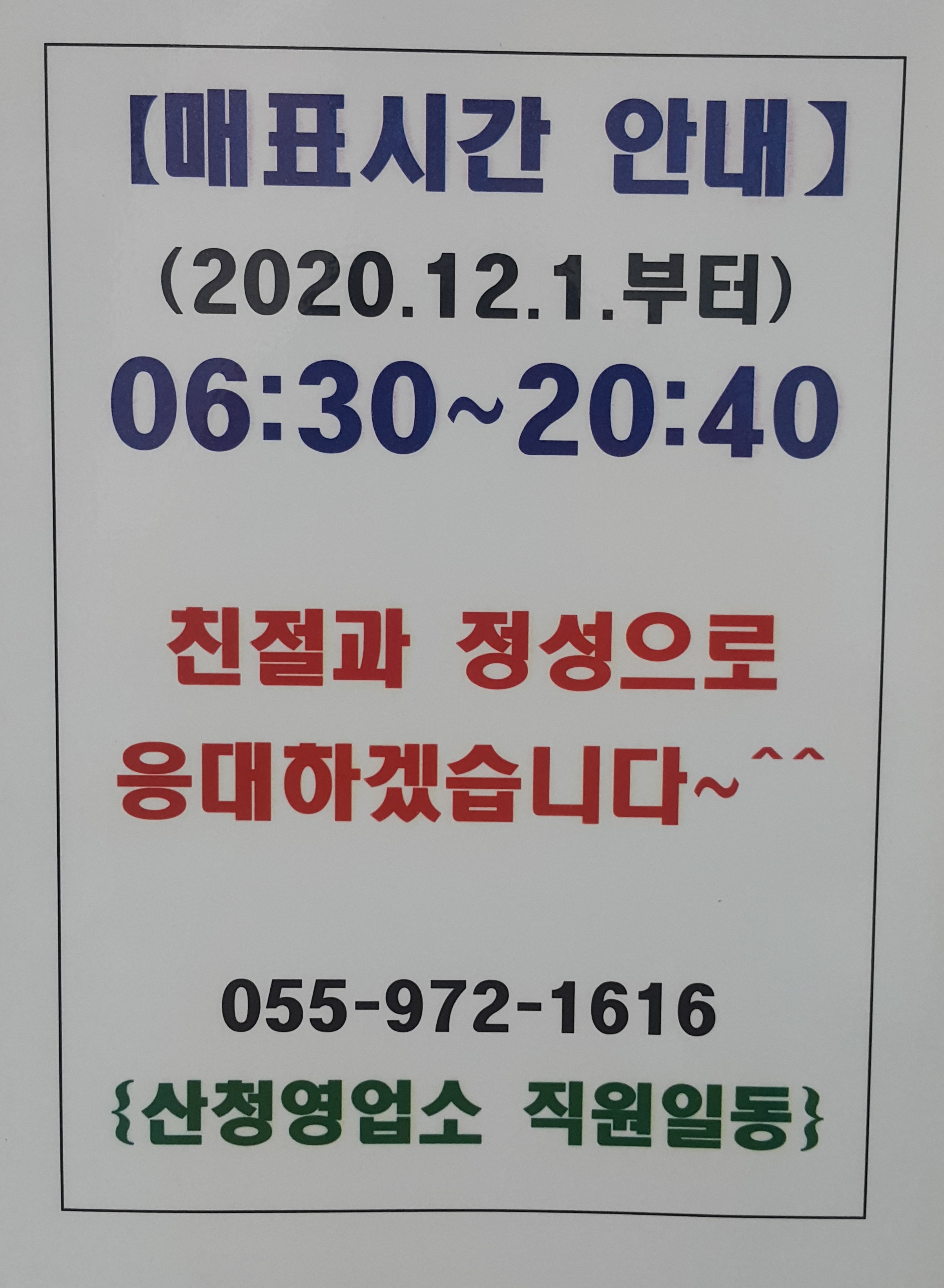 산청시외버스터미널 출발 함양, 장계, 거창, 남원, 전주 방면.