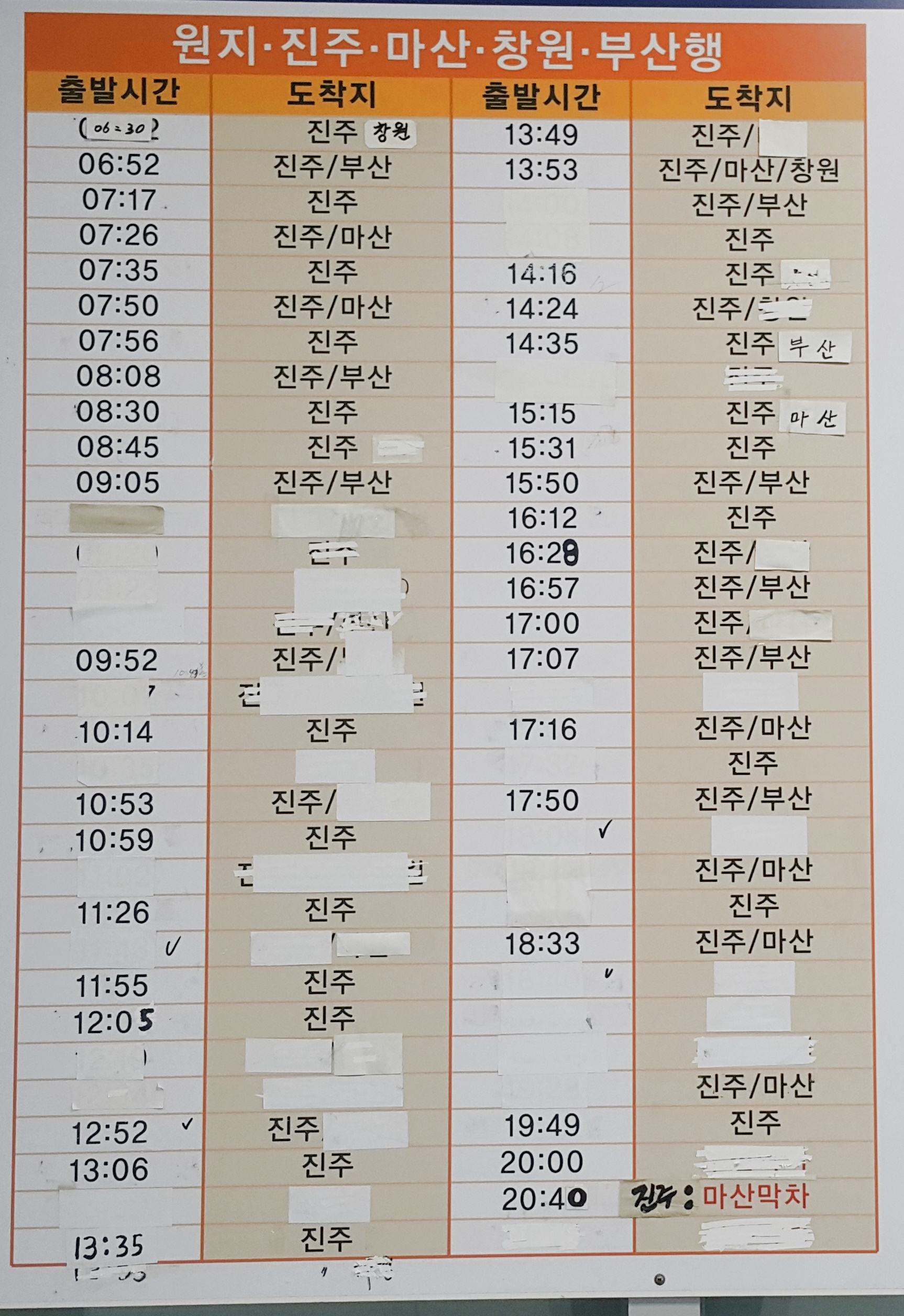 산청 출발 원지, 진주, 마산, 창원, 부산 방면