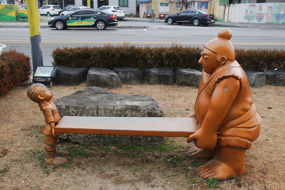 장성역 앞 정원의 벤치는 홍길동 캐릭터가 벤치를 받치고 있어