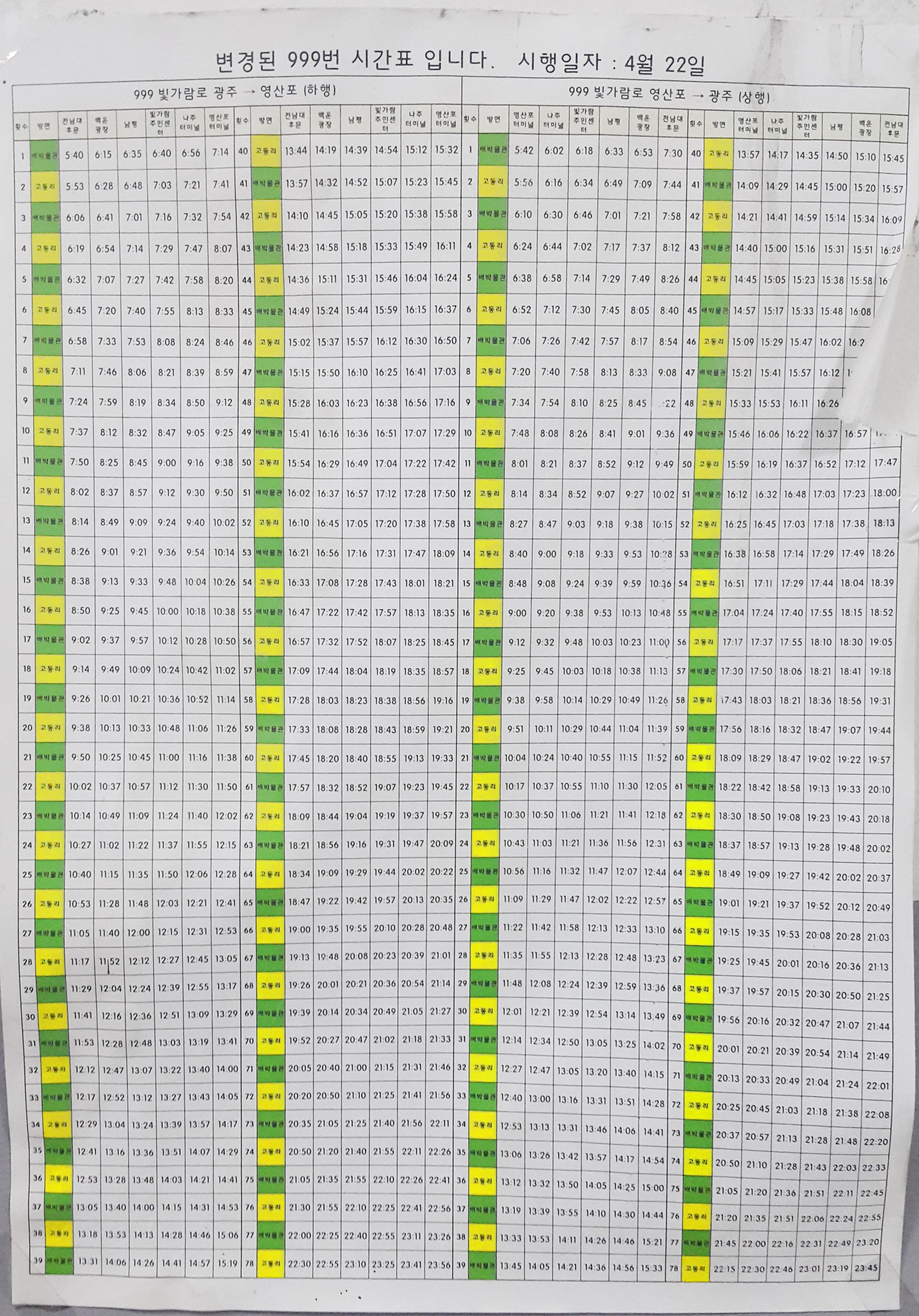 영산포터미널출발 전대후문 999번상행 시간표
