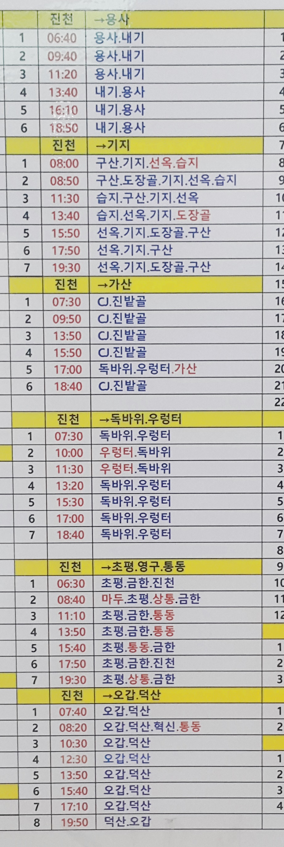 진천 출발 혁신도시, 대소, 죽전, 서울 남부터미널, 동서울 방면.