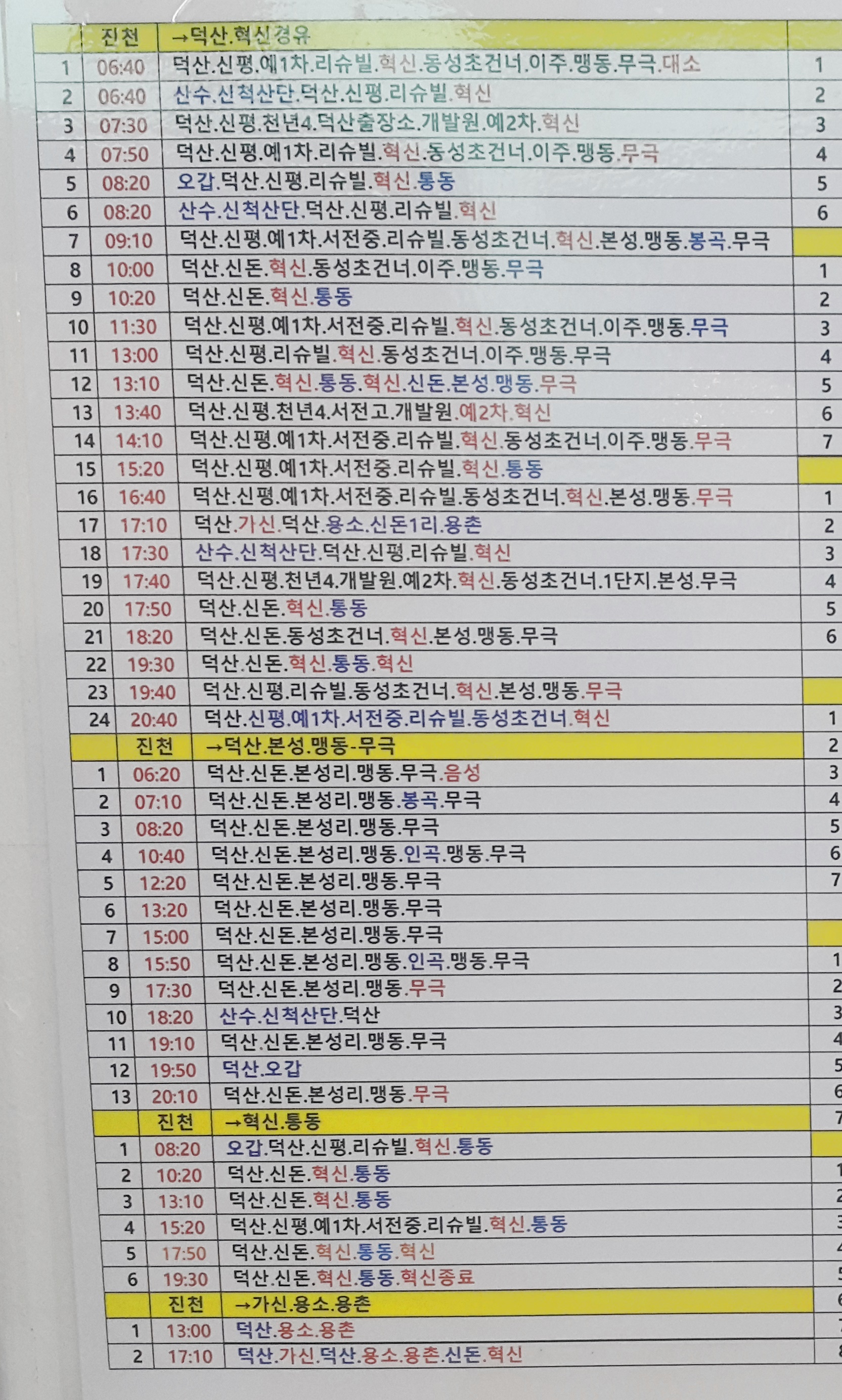 진천 출발 수원, 안산, 인천, 부천, 안양, 성남, 천안, 병천 방면.