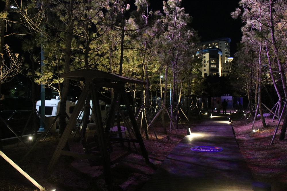 해변의 원두막을 비롯한 조형물들이 빛을 반사하여 더욱더 아름다운 삼척해수욕장의 야경을 만들어 냅니다.