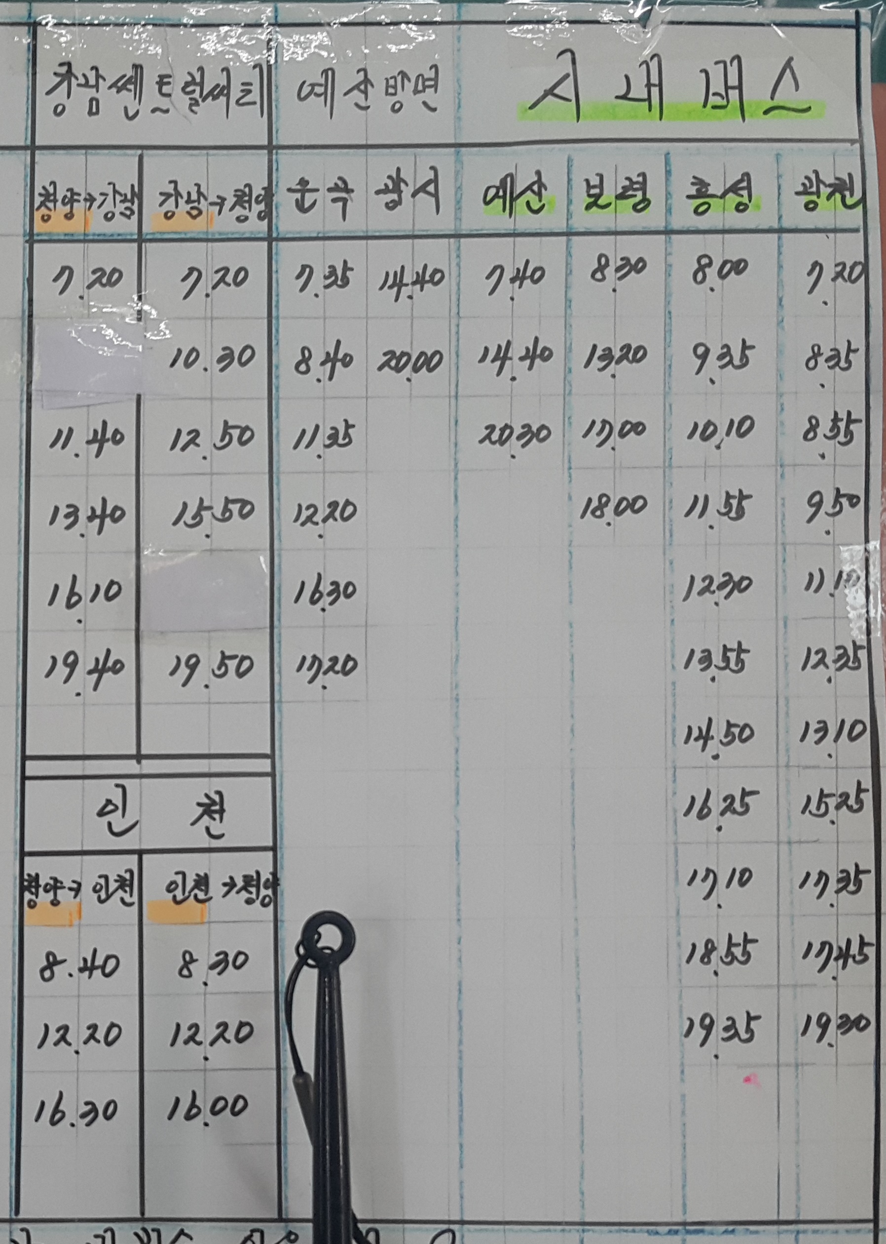청양 출발 강남센트럴씨티, 인천, 예산 방면.
