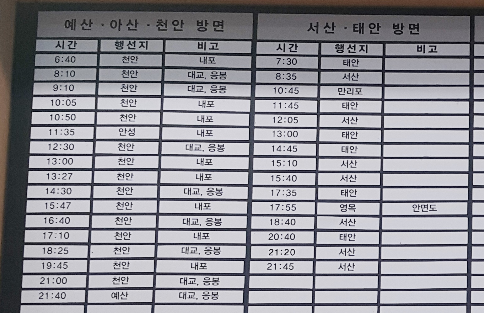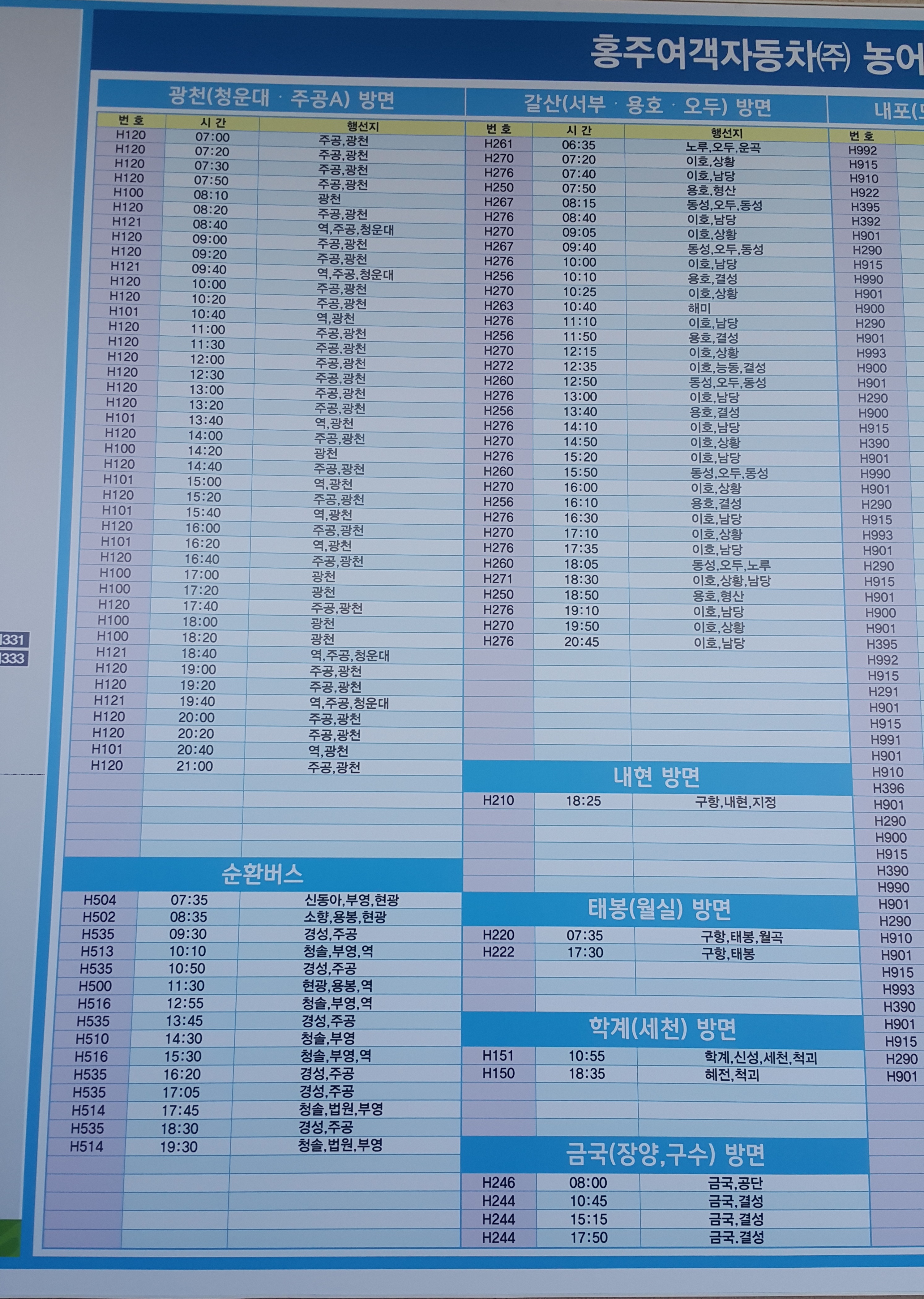 홍성 출발 예산, 아산, 천안, 서산, 태안 방면.
