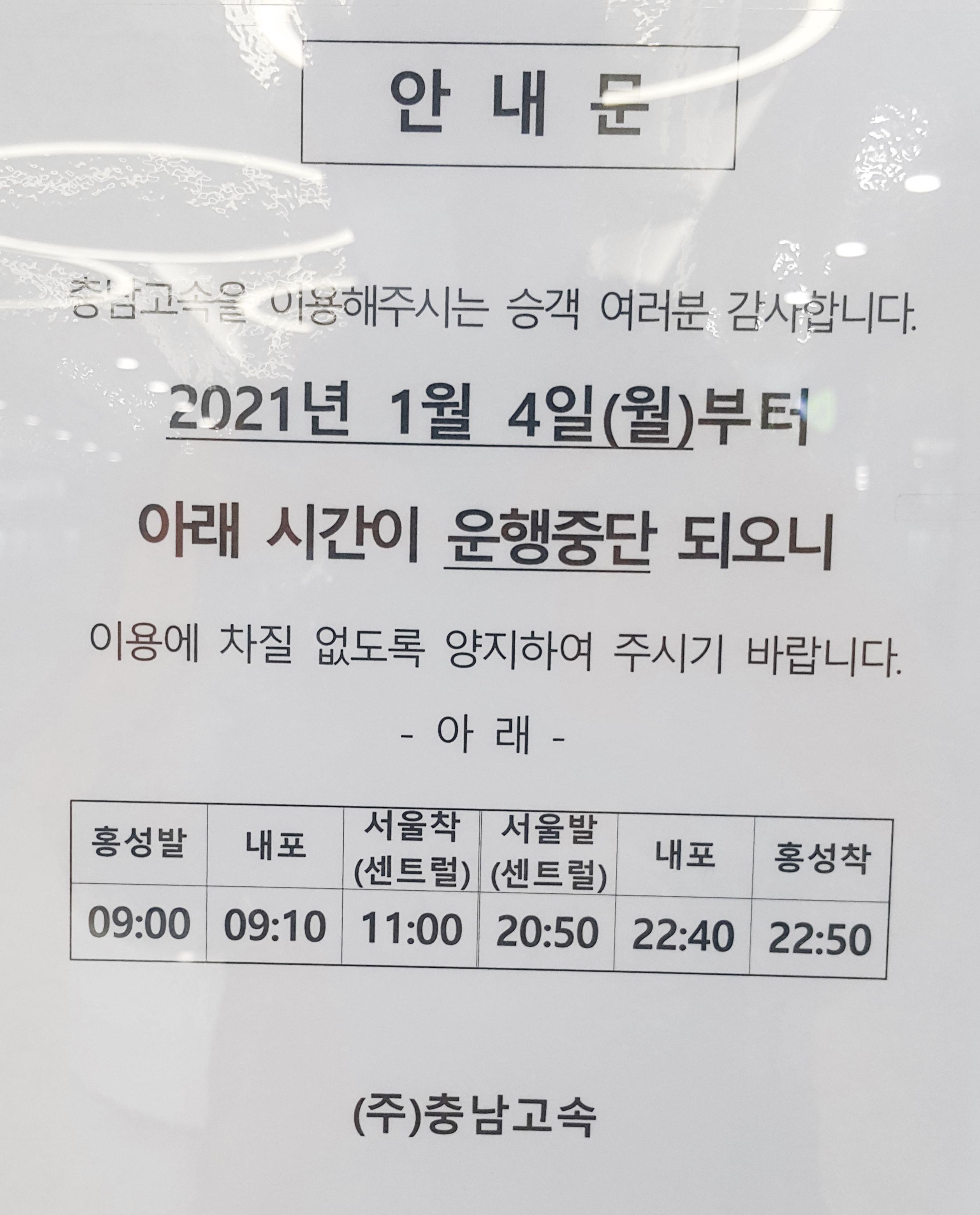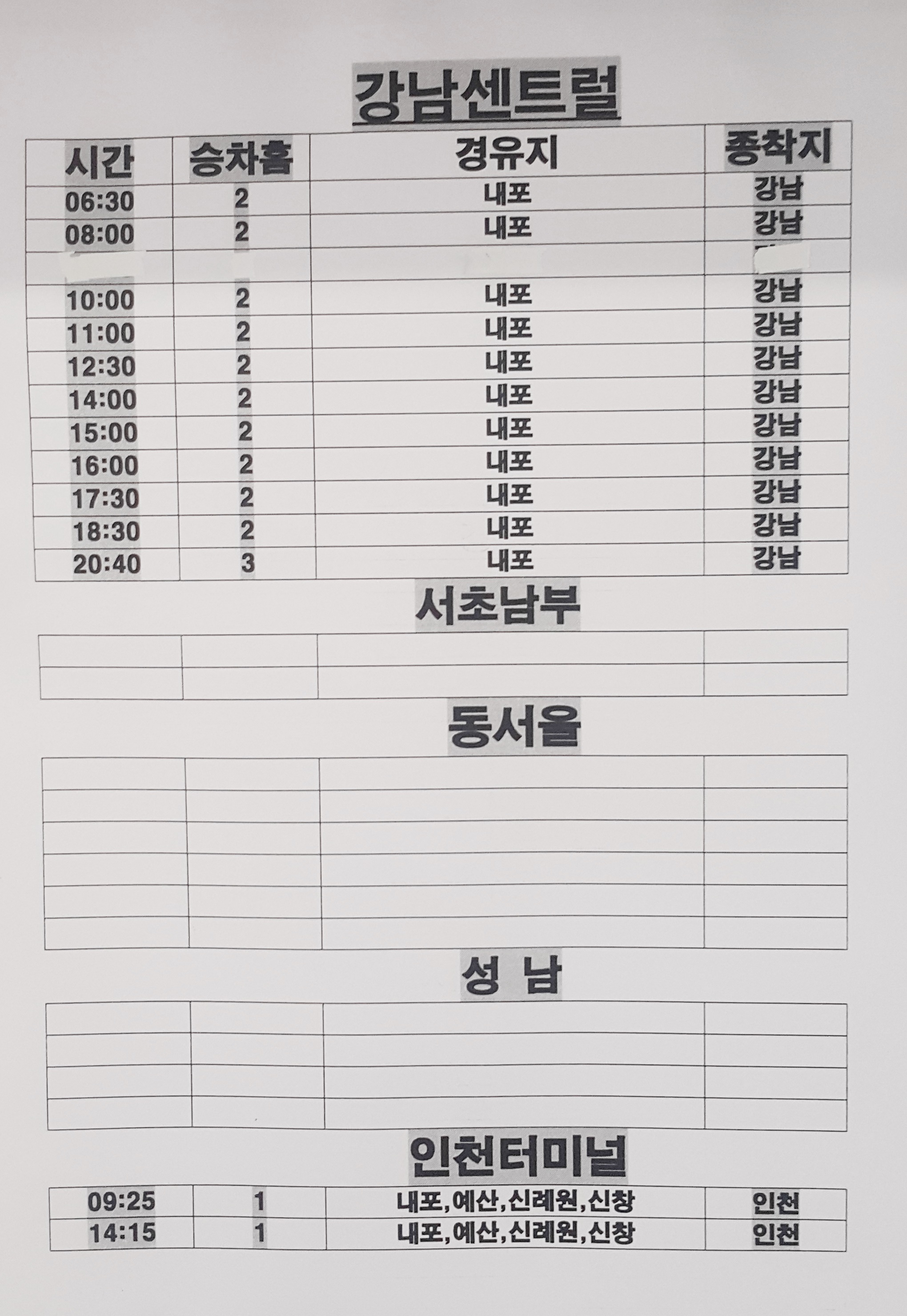 홍성 출발 강남센트럴, 인천터미널 방면.