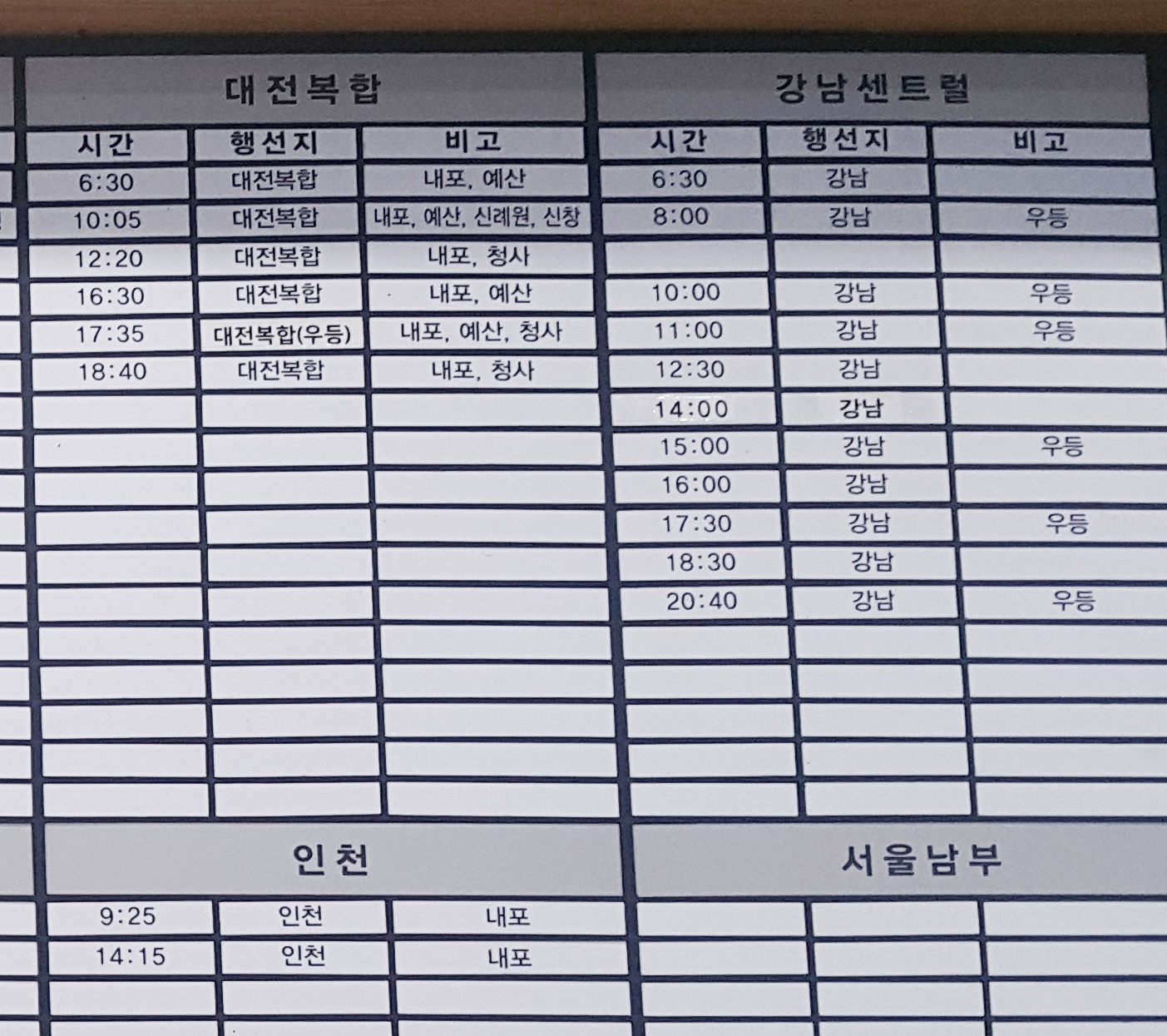 홍성 출발 대전복합, 강남센트럴, 인천, 서울남부 방면.
