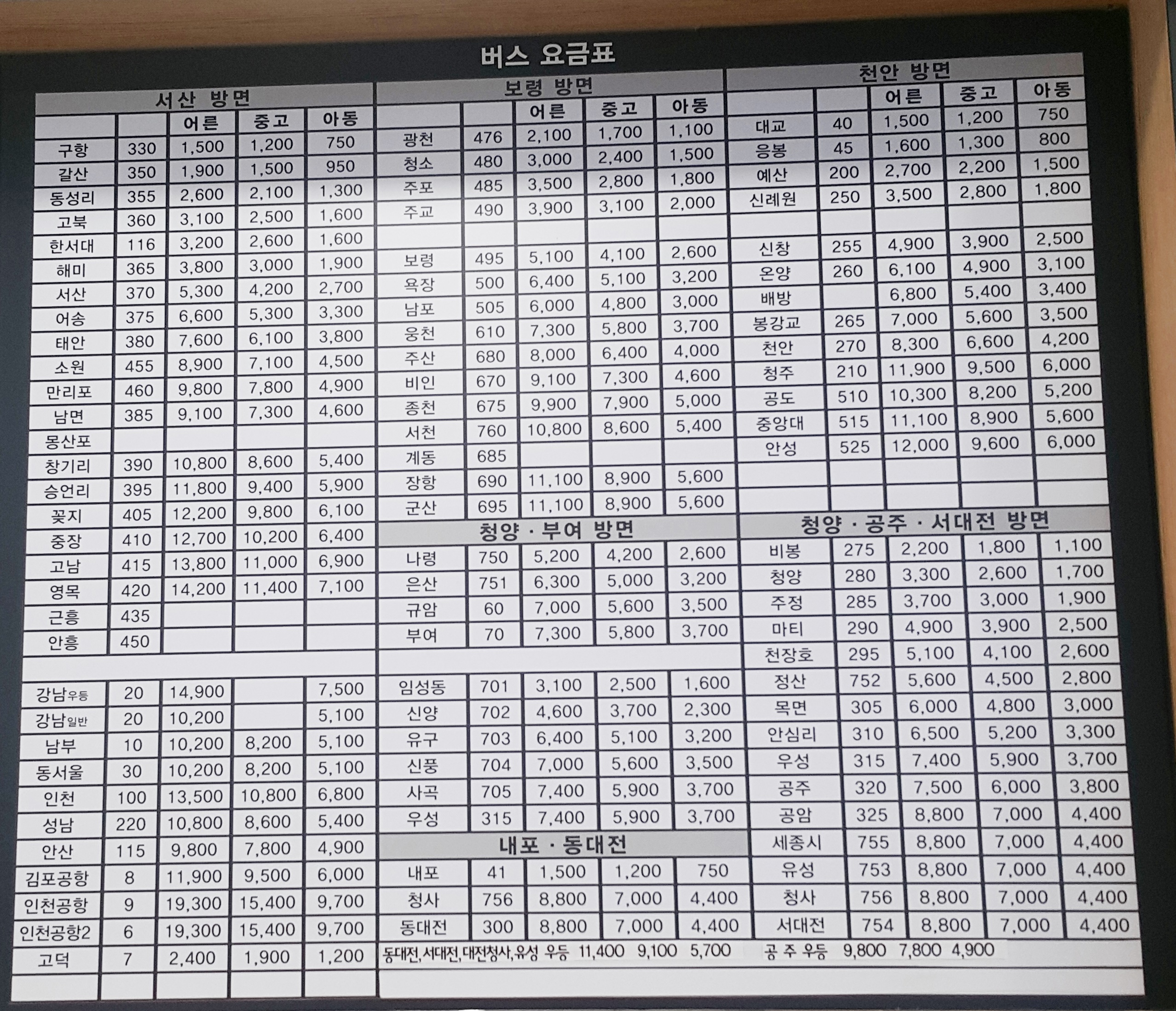 홍성시외버스터미널 요금표