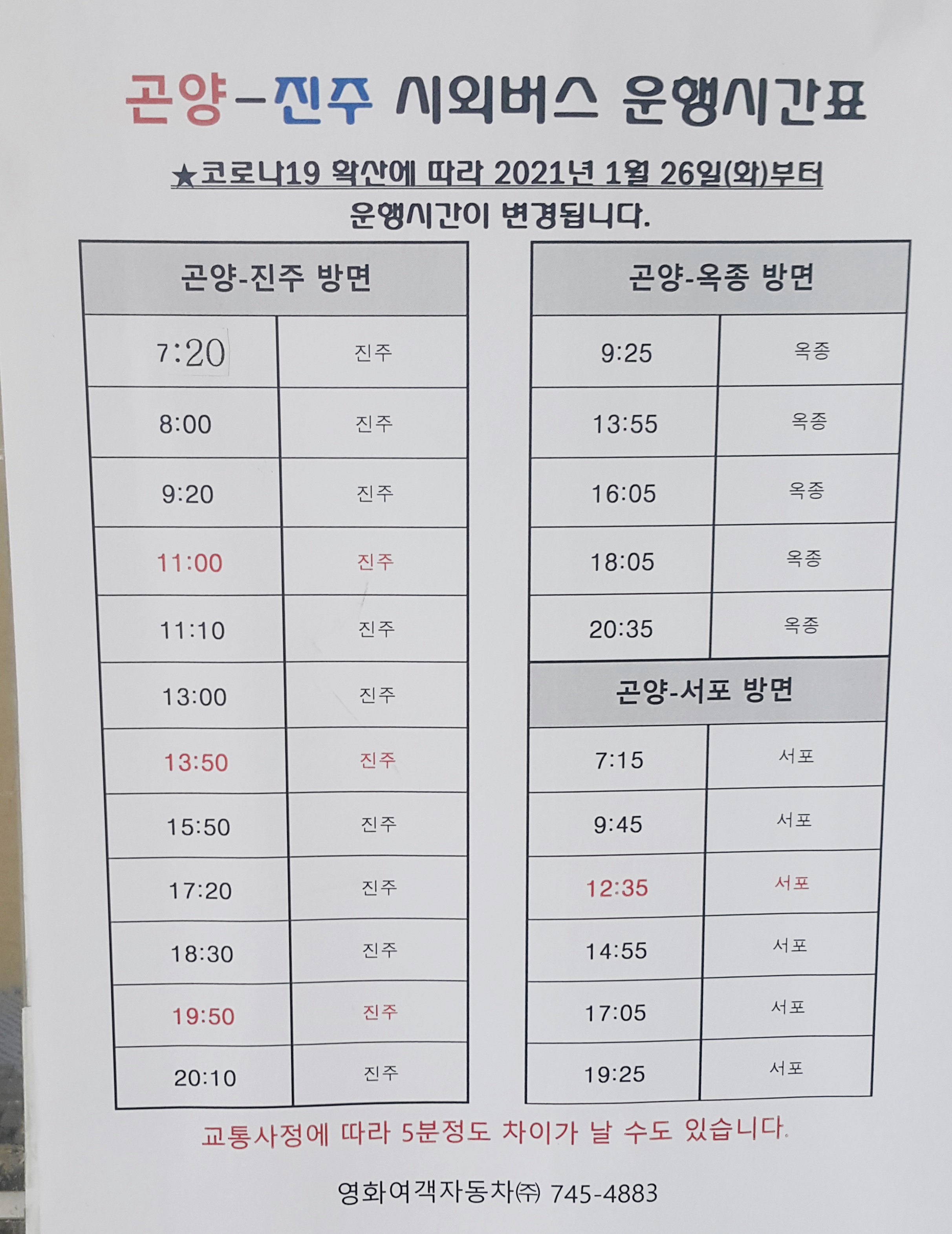 곤양 출발 부산, 진주, 마산, 창원, 하동, 진교, 남해, 서포, 옥종, 완사 방면.