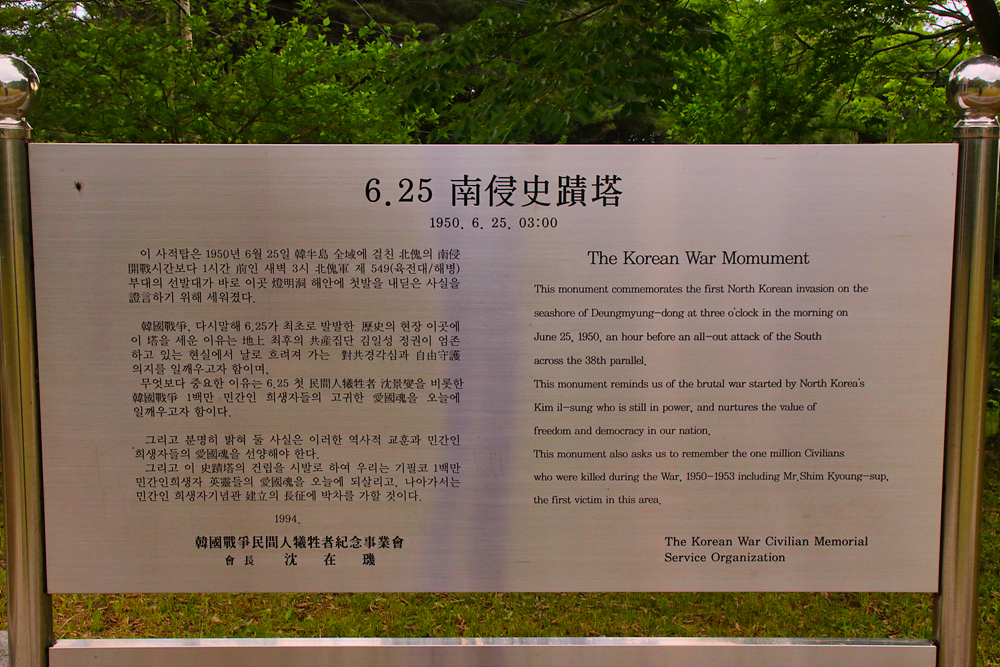 이 사적 탑은 1950년 6월 25일 새벽 3시 북한군 제549부대의 선발대가 바로 이곳 해안에 첫발을 내디딘 사실을