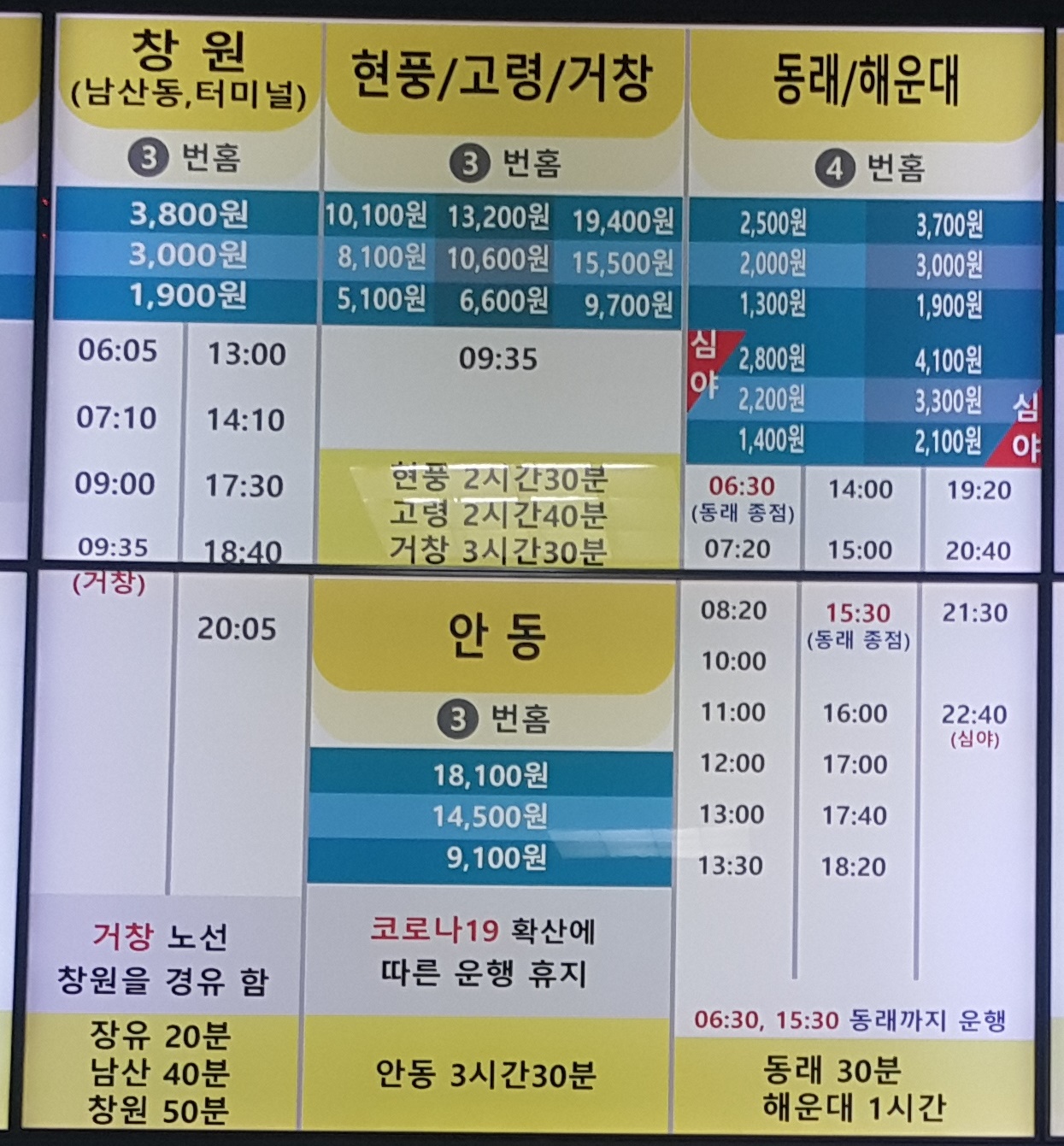 3번홈 창원 남산동, 창원터미널, 현풍, 고령, 거창, 안동 방면.