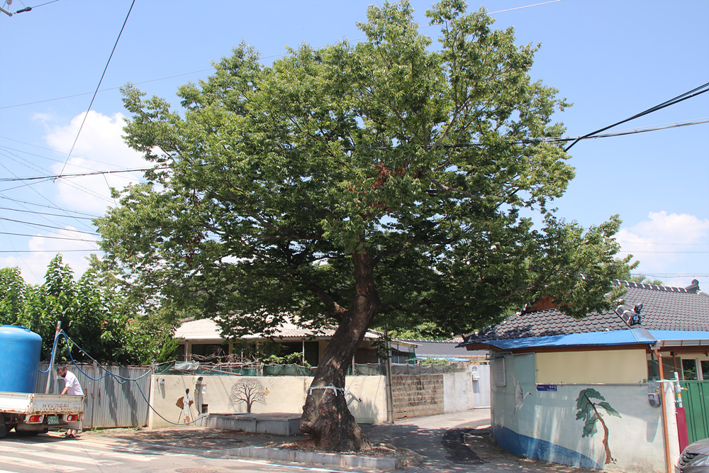 마을의 노거수를 중심으로 소나무와 지게에 짐을 싣는 사람의 모습이 그려져 있습니다.