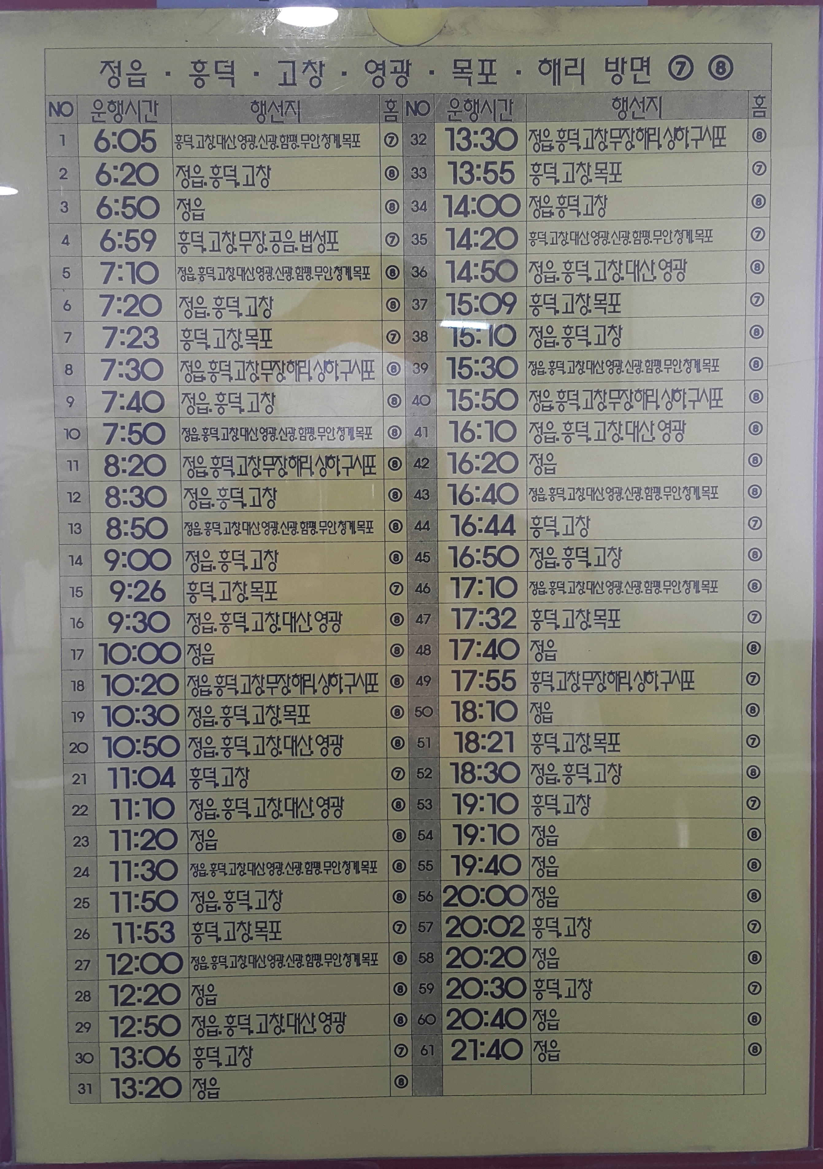 전주시외버스터미널 출발 정읍, 흥덕, 고창, 영광, 목포, 해리 방면.