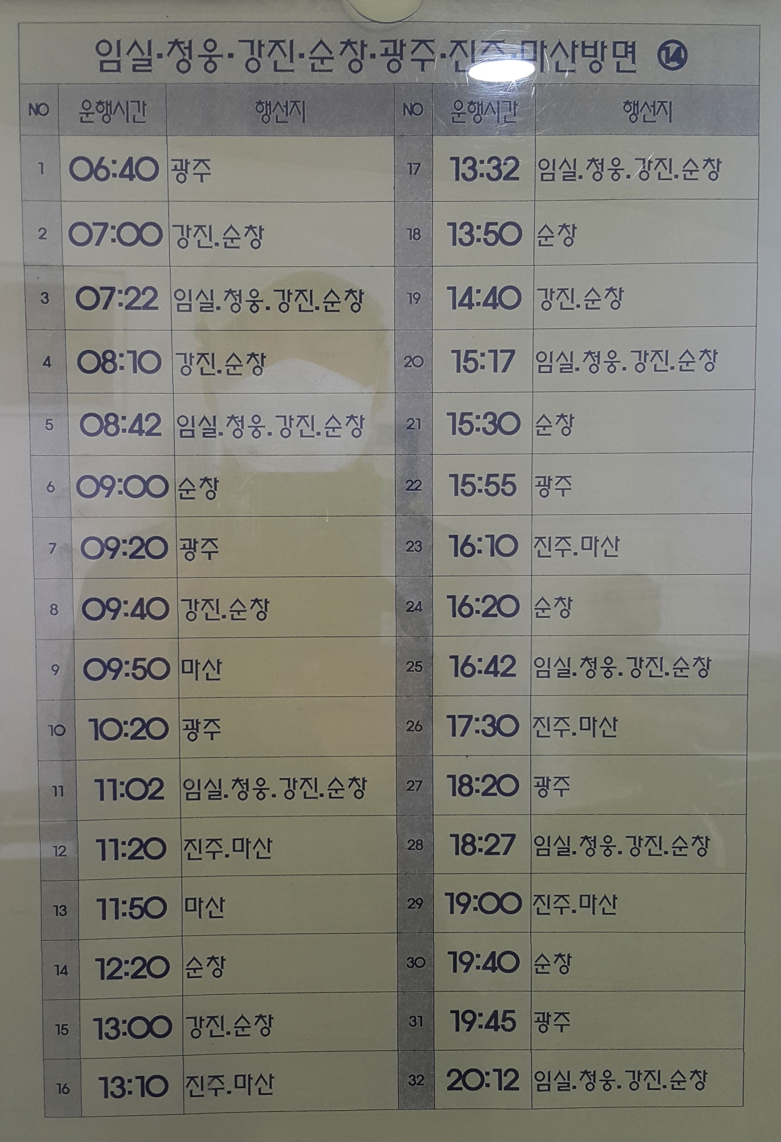 전주시외버스터미널 출발 임실, 청웅, 강진, 순창, 광주, 진주, 마산 방면.