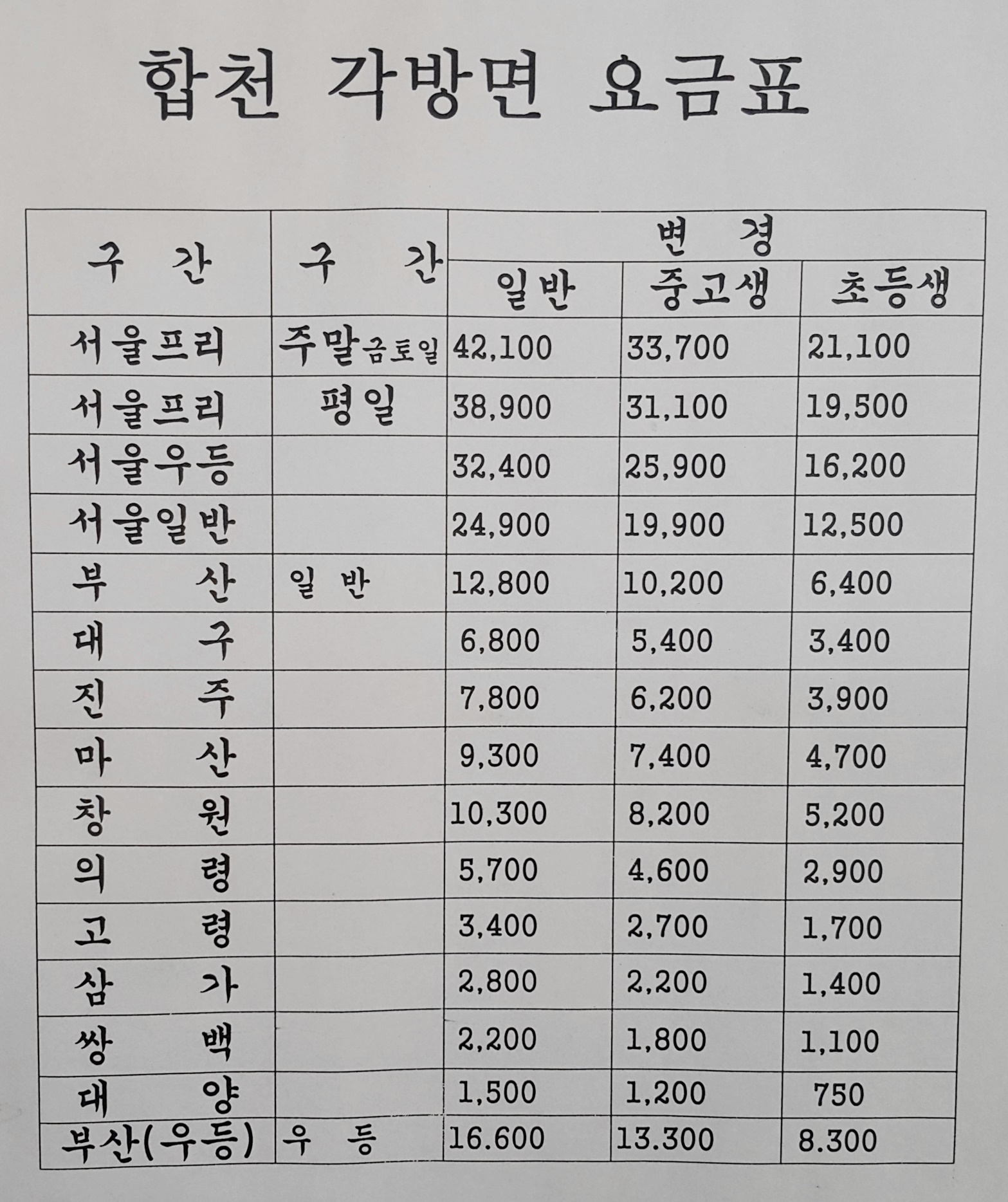 합천 각 방면 요금표