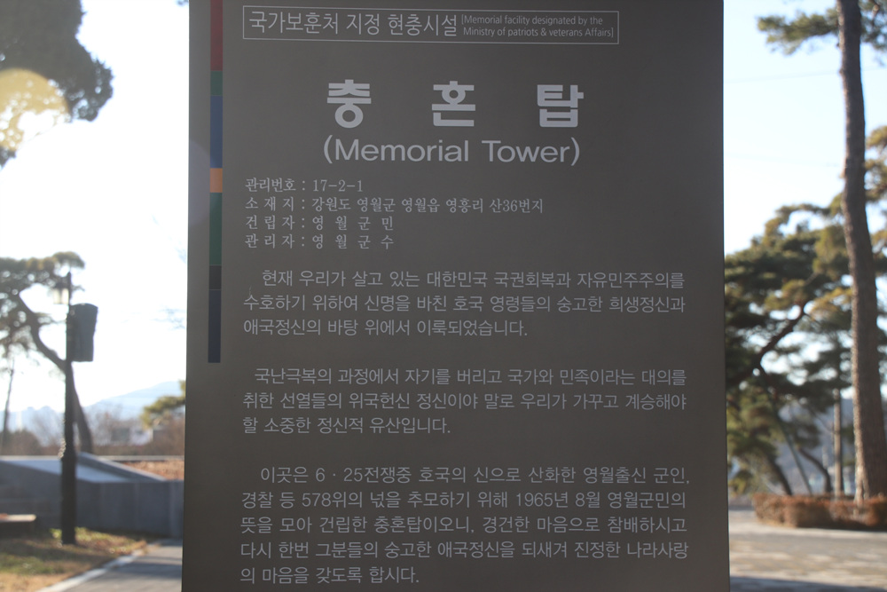 이곳은 6.25 전쟁중 호국의 신으로 산화ㅏ한 영월출신 군인, 경찰 등578위의 넋을 추모하기 위해 1965년 8월 영월군민의 뜻을 모아 건립하였습니다.