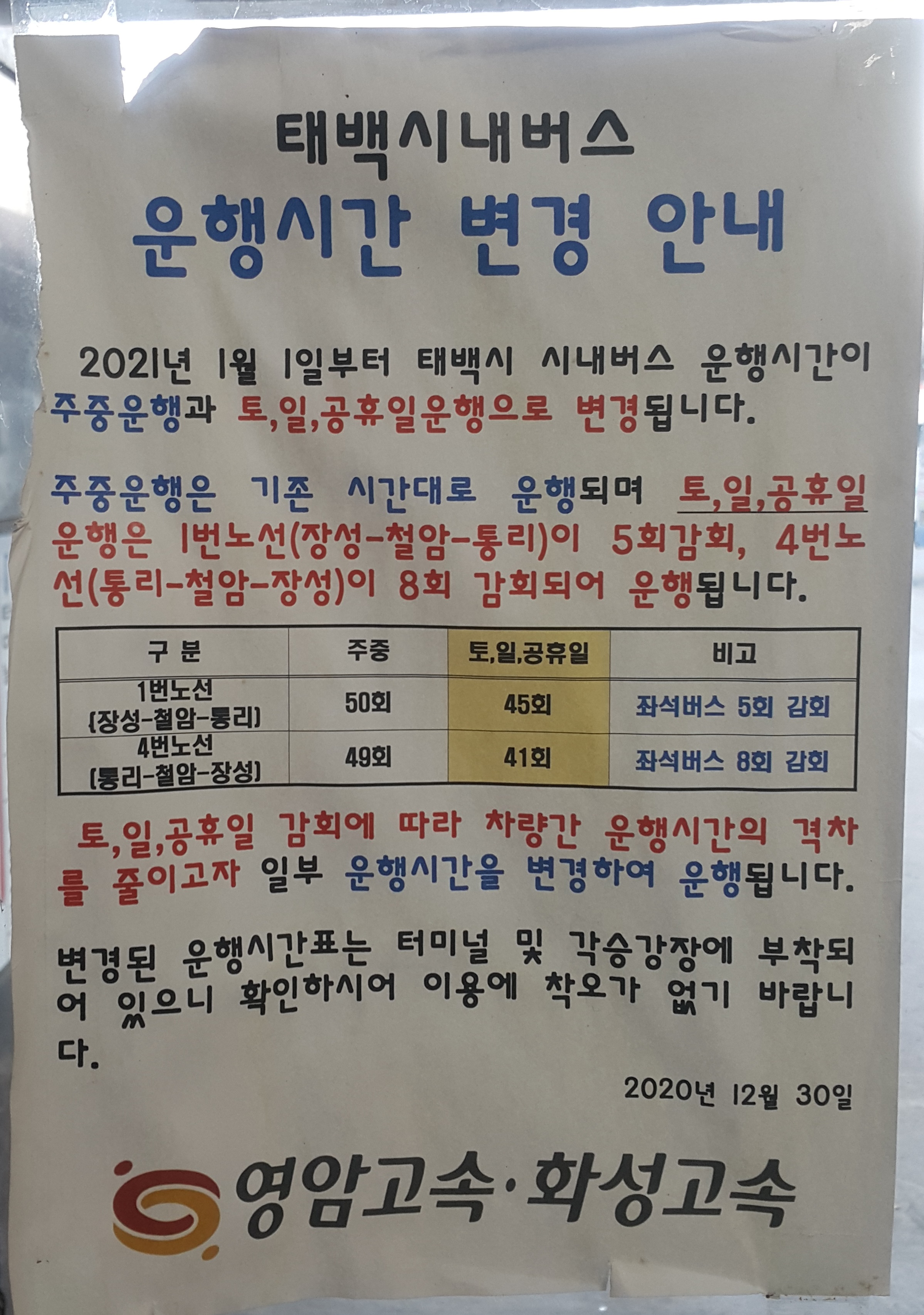 태백 출발 하장, 토산(예수원), 풍곡, 호산, 고한 방면.