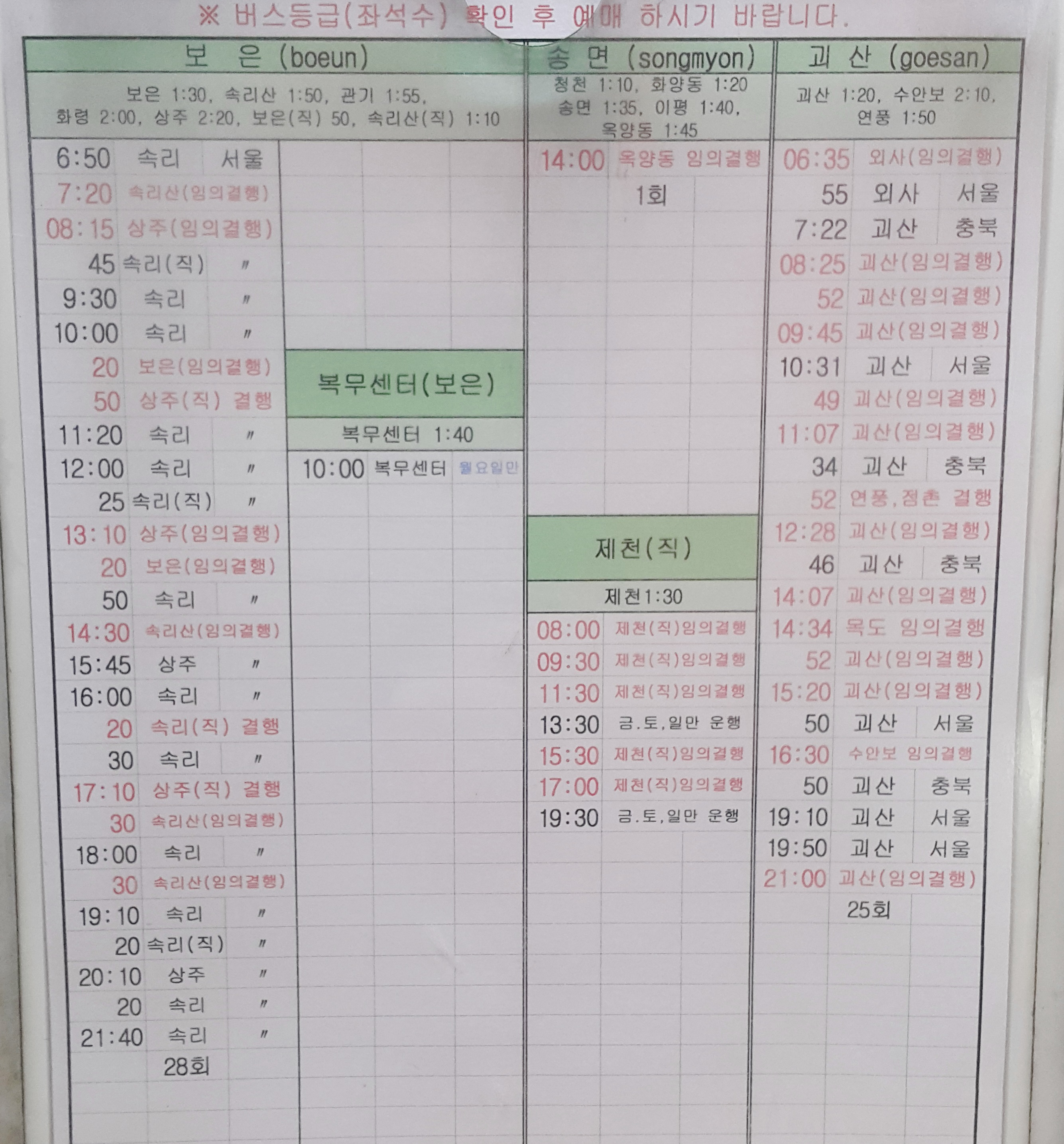 청주 출발 보은, 송면, 괴산, 보은 복무센터, 제천 방면.