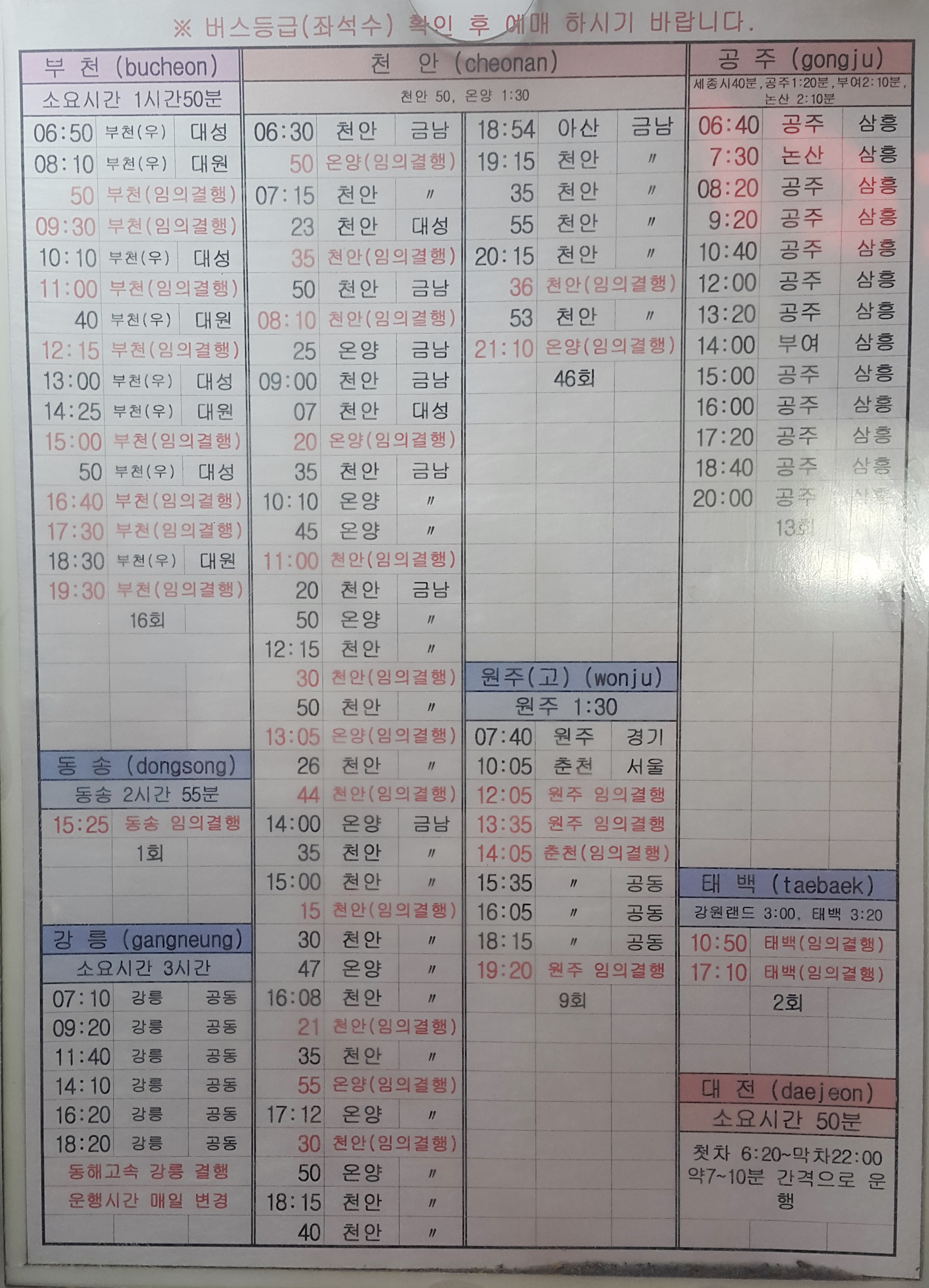 청주시외버스터미널 출발 부천, 천안, 공주, 동송, 강릉, 원주, 태백, 대전 방면.