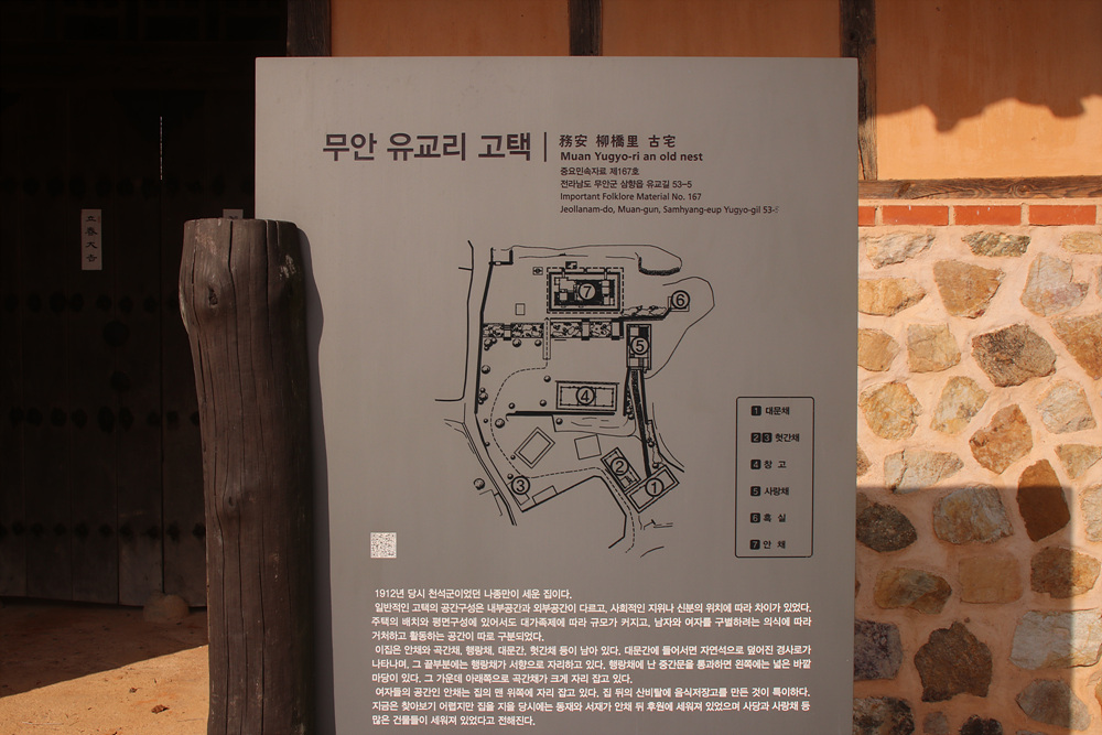 무안 유교리 고가는 대문채, 헛간채 2곳, 창고, 사랑채, 흑실, 안채가 남아있으며