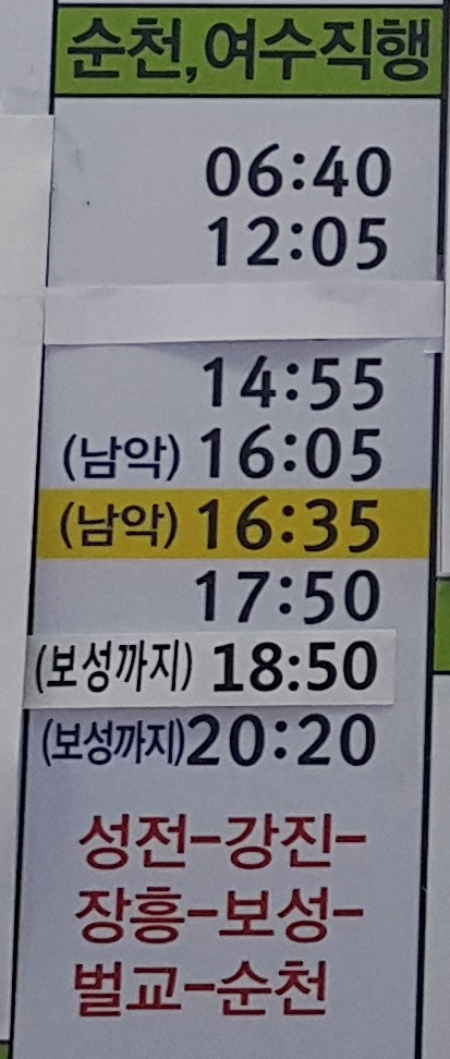 목포 출발 순천, 해남, 남악, 성전, 강진, 장흥, 보성, 별교 방면