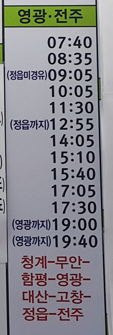 목포 출발 청계, 무안, 함평, 영광, 대산, 고창, 정읍, 전주 방면.