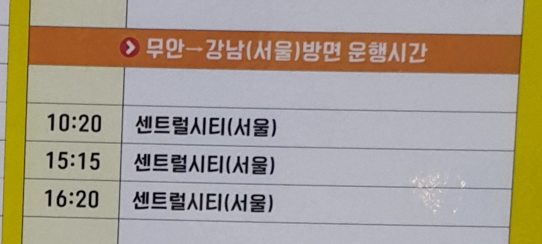 무안 출발 강남, 서울, 센트럴시티 방면.