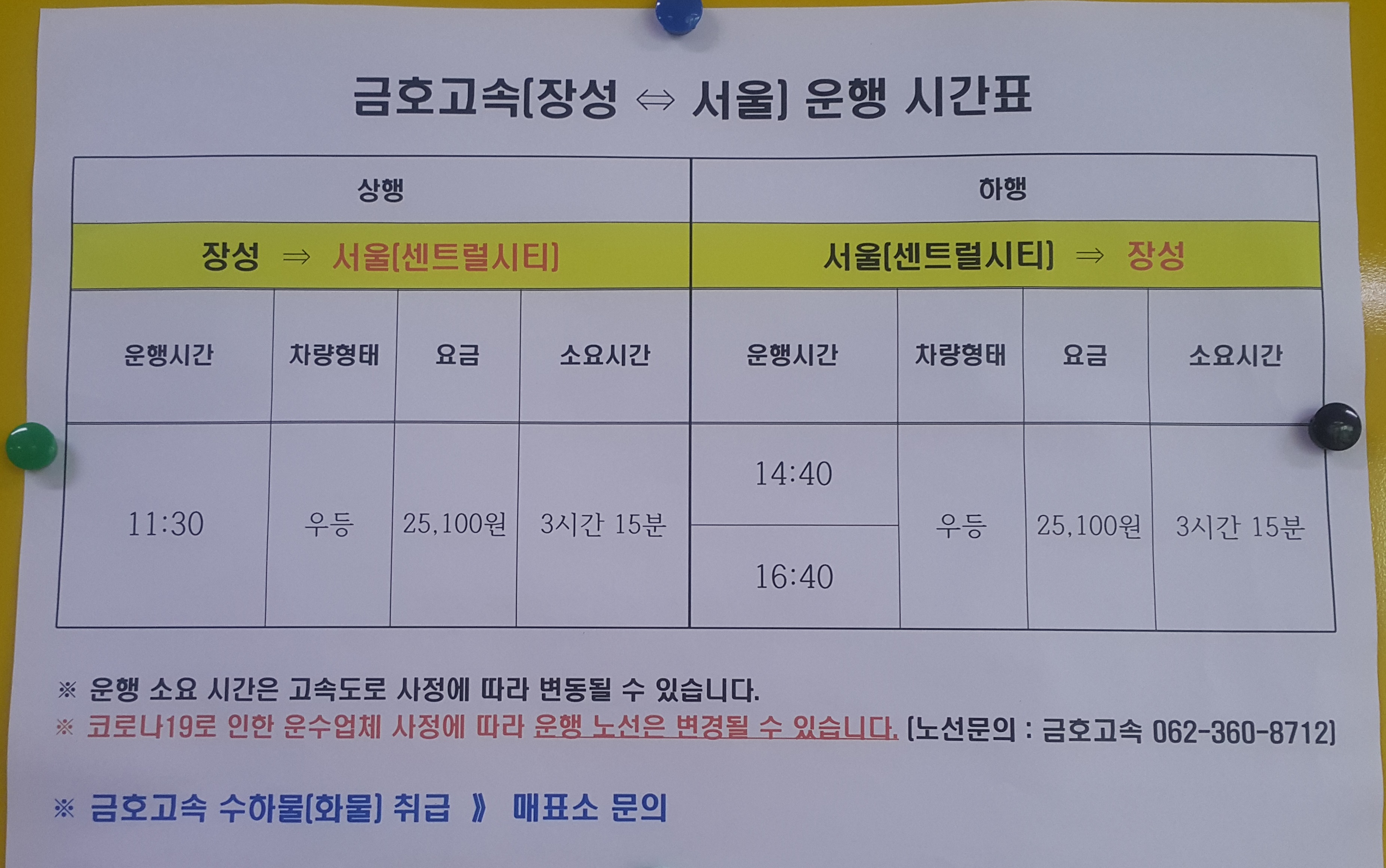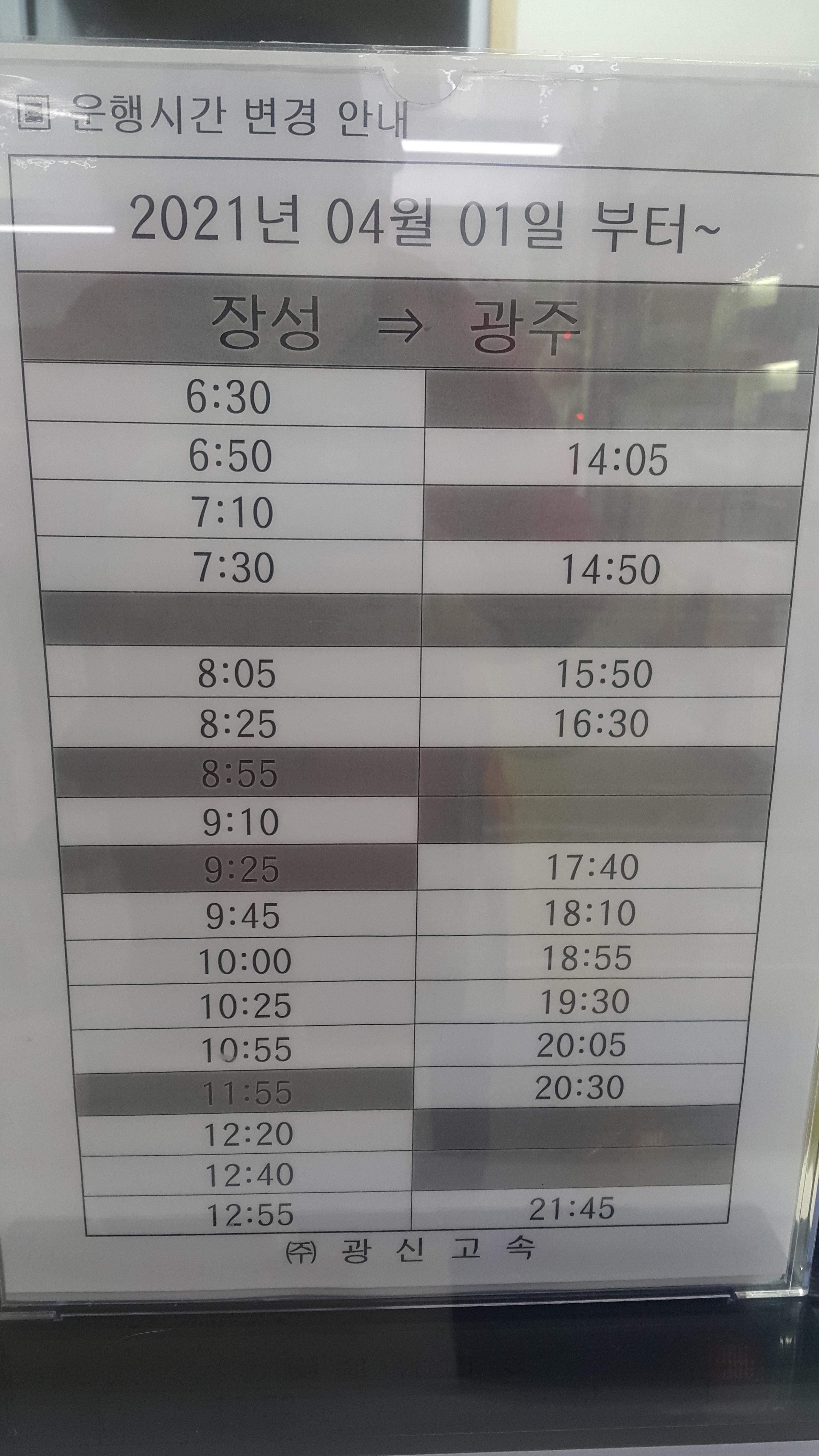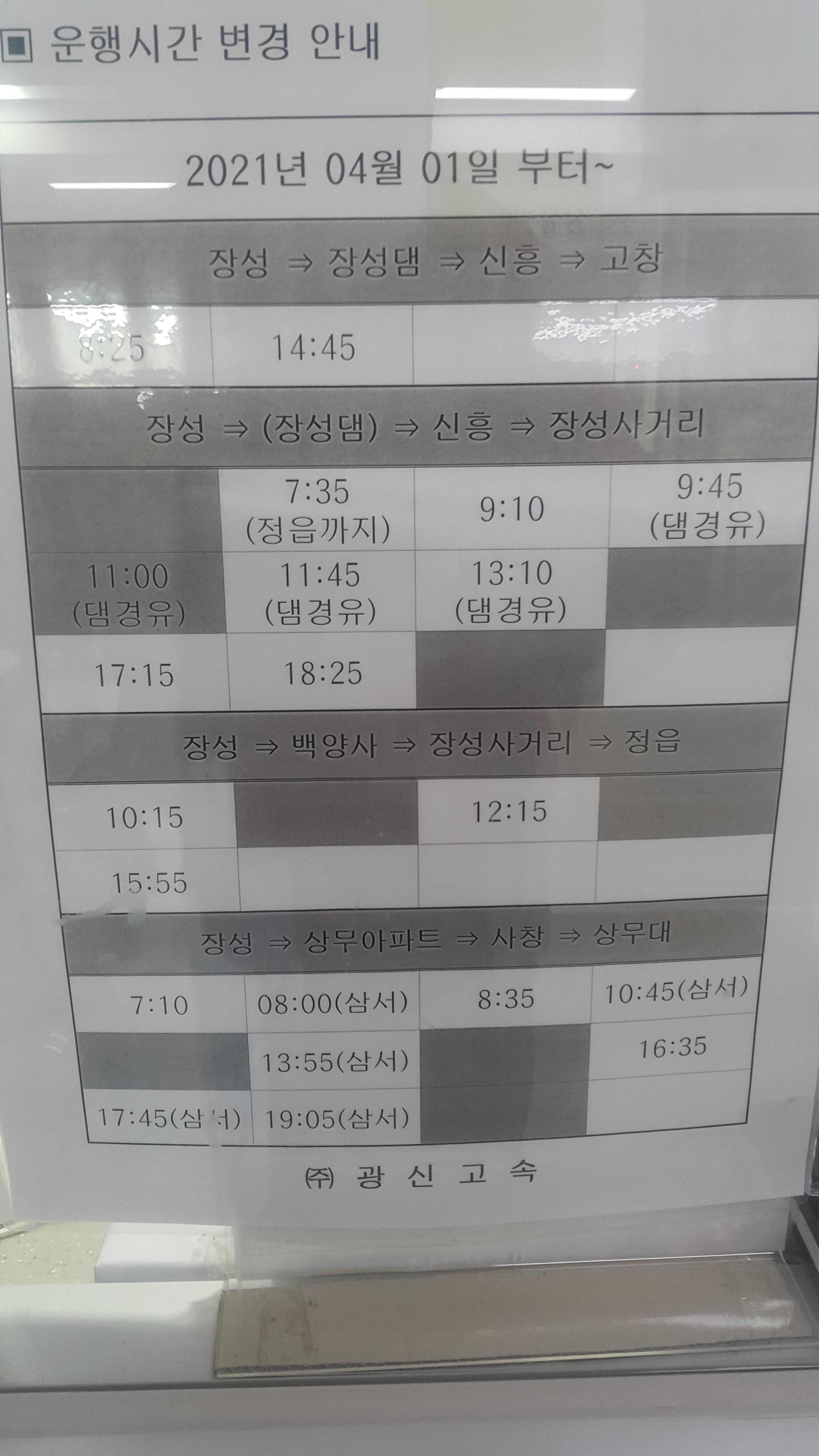 장성 출발 장성댐, 상무대, 신흥, 고창, 정읍 방면.